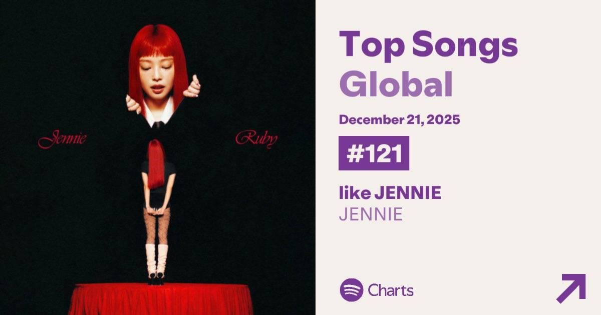 เพลง ‘Like JENNIE’ ของ JENNIE เป็นเพลงที่ได้รับความนิยมเพิ่มขึ้นมากที่สุดในชาร์ต Spotify ทั่วโลก โดยขยับขึ้น 41 อันดับ มาอยู่ที่อันดับ 121 ด้วยยอดสตรีม 1.46 ล้านครั้ง