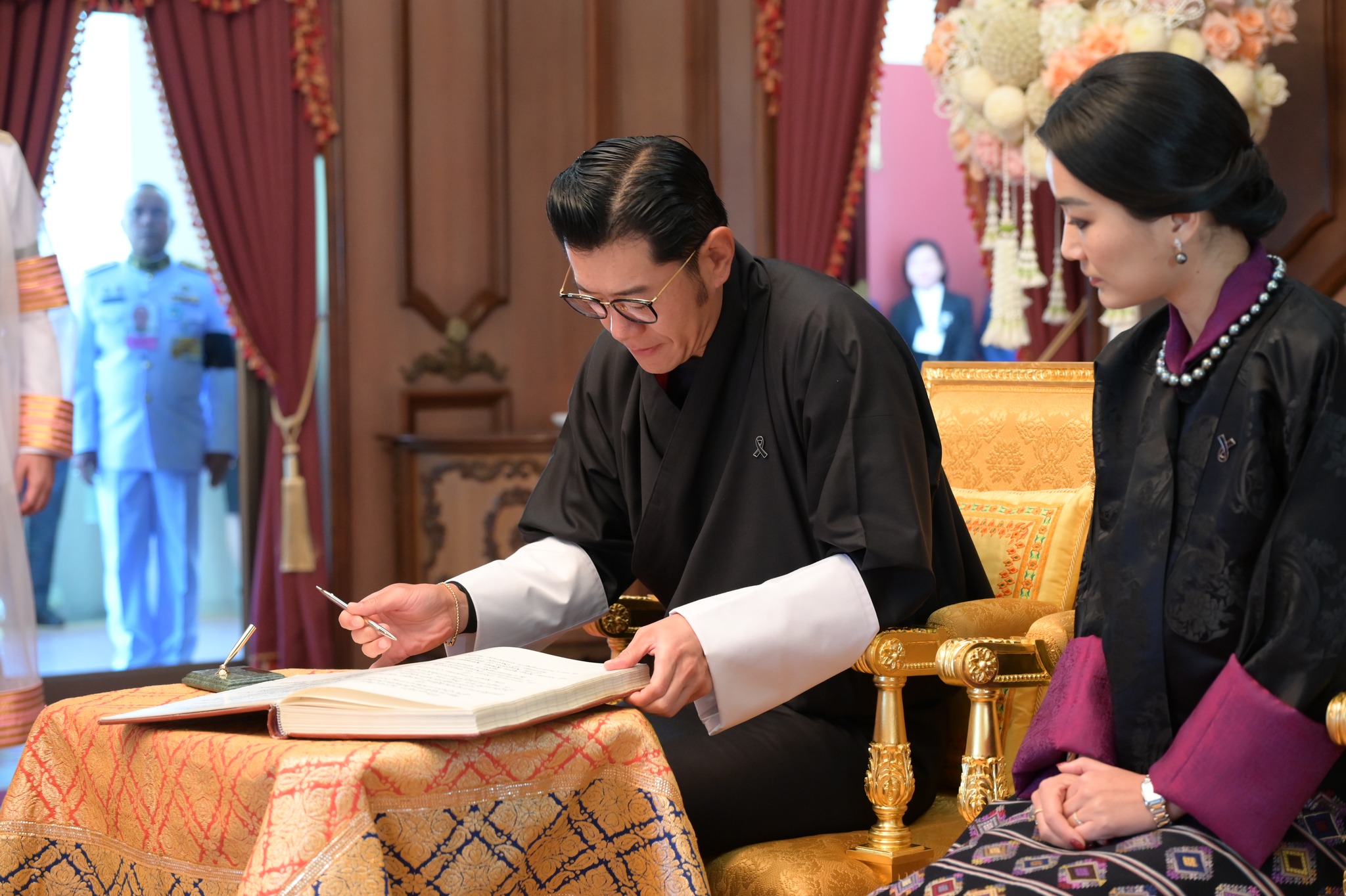สมเด็จพระราชาธิบดีจิกมี เคเซอร์ นัมเกล วังชุก และสมเด็จพระราชินี เจตซุน เพมา วังชุก เสด็จเข้าห้องรับรอง หอประชุมจุฬาฯ ทรงลงพระปรมาภิไธยและพระนามาภิไธยในสมุดเยี่ยม ศ.(พิเศษ) ดร.สุรเกียรติ์ เสถียรไทย นายกสภาจุฬาลงกรณ์มหาวิทยาลัย ทูลเกล้าฯ ถวายฉลองพระองค์ครุยดุษฎีบัณฑิตกิตติมศักดิ์แด่สมเด็จพระราชาธิบดีจิกมี เคเซอร์ นัมเกล วังชุก ศ.ดร.วิเลิศ ภูริวัชร อธิการบดีจุฬาฯ ทูลเกล้าฯ ถวายฉลองพระองค์ครุยดุษฎีบัณฑิตกิตติมศักดิ์แด่สมเด็จพระราชินีเจตซุน เพมา วังชุก