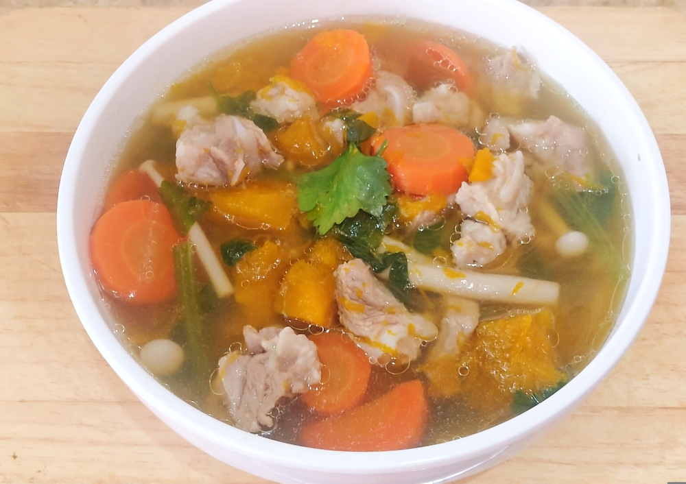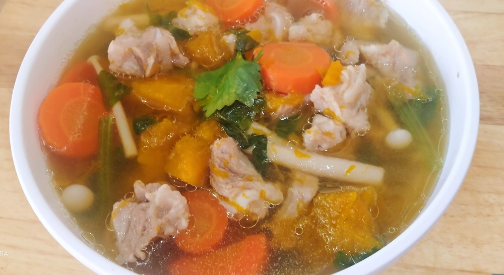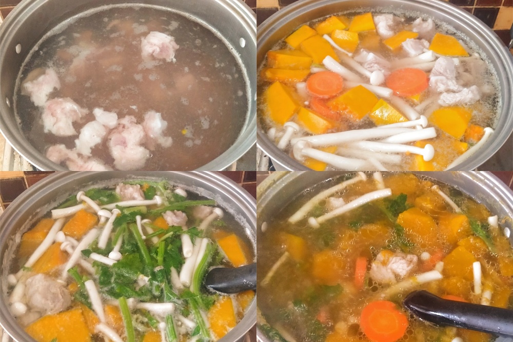 3. น้ำเดือด เปิดฝาหม้อช้อนฟองออก แล้วใส่แครอท ฟักทอง เห็ด ลงไป ปิดฝาหม้อ ต้มต่อ 30 นาที