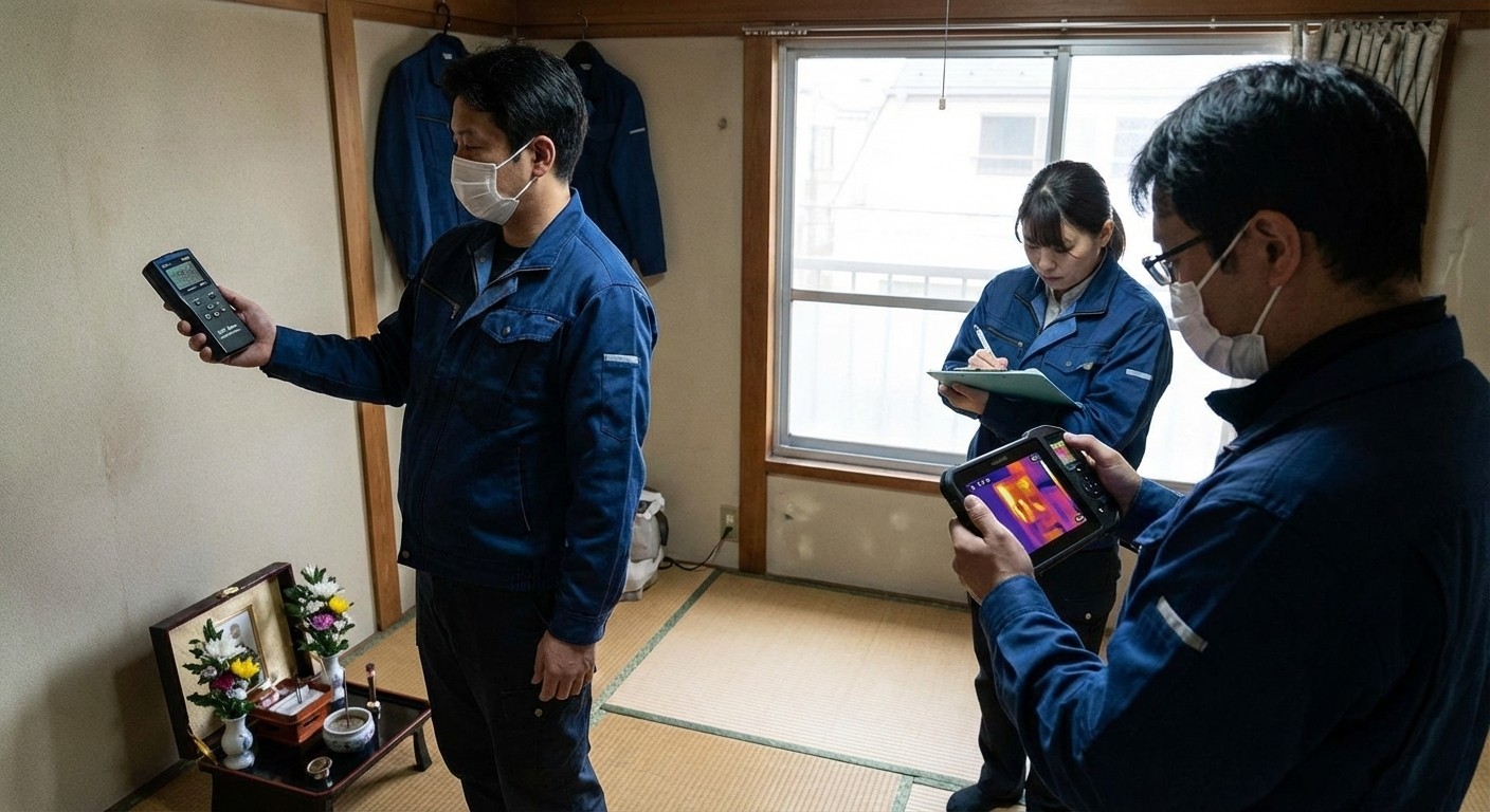 กล้องตรวจจับความร้อน (Infrared/Thermal Camera) เพื่อเช็กหา "จุดเย็น" (Cold Spots) ในห้อง ซึ่งอาจเกิดจากรอยรั่วของอากาศหรือปัญหาโครงสร้างที่ทำให้คนรู้สึกขนลุก