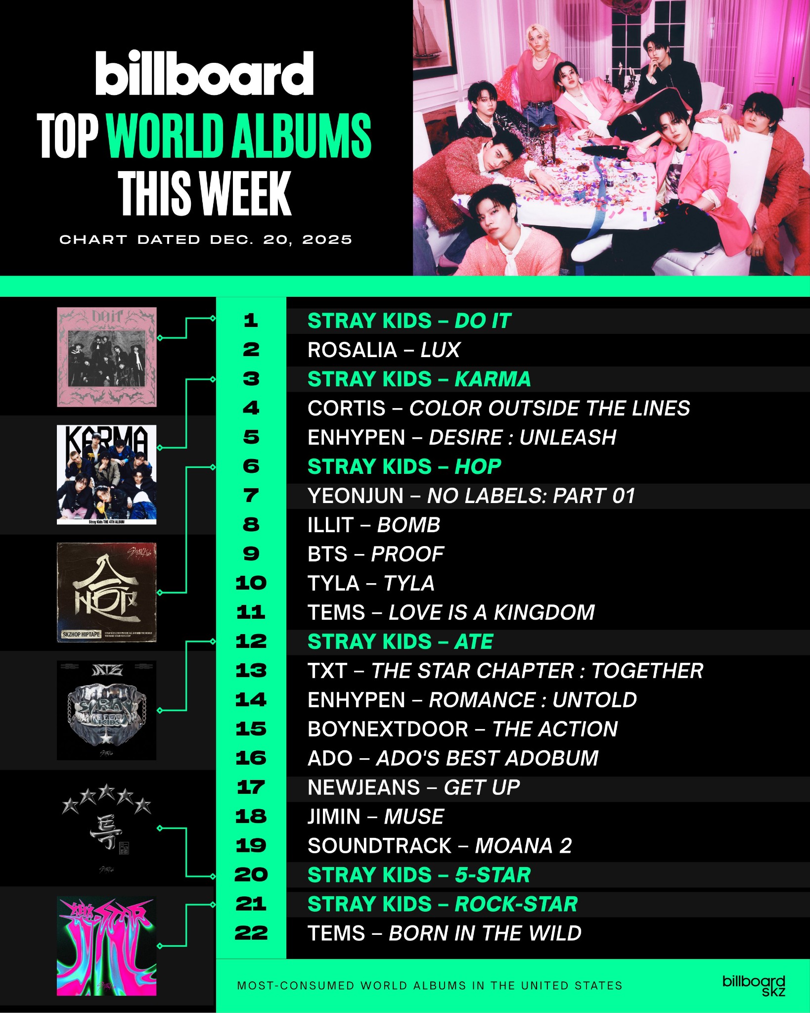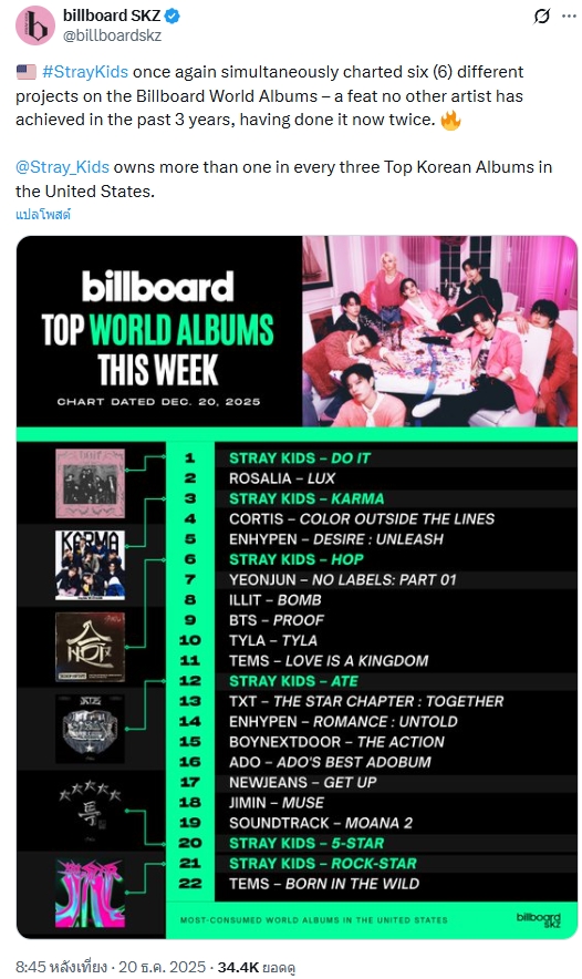 🔥 Stray Kids ติดอันดับชาร์ต Billboard World Albums พร้อมกัน 6 อัลบั้ม อีกครั้ง!! ไม่เพียงแต่จะเป็นจำนวนมากที่สุดและไม่มีศิลปินคนใดทำได้ในรอบสามปีที่ผ่านมาเท่านั้น แต่ SKZ ยังทำเป็นสัปดาห์ที่สองติดต่อกันอีกด้วย