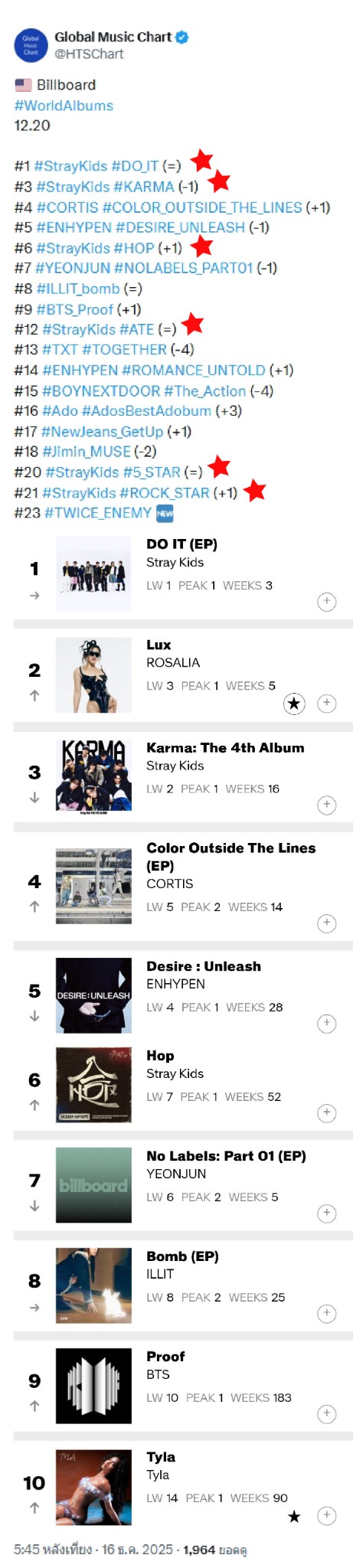 อ้างอิงกระทู้ก่อน 🔥 Stray Kids สถิติติดชาร์ต Billboard World Albums พร้อมกัน 6อัลบั้มและเป็นศิลปินแรกในรอบกว่า 3 ปีที่ทำได้ในสัปดาห์เดียว