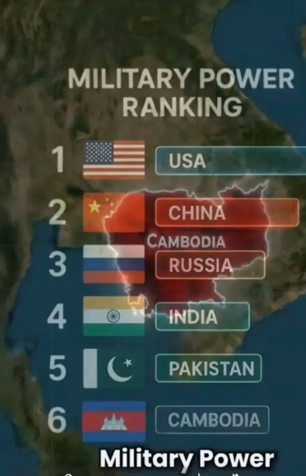 ข้อมูล ว่ากองทัพกัมพูชามีความเก่งทางทหารกว่า เกาหลีใต้ อังกฤษ อิสราเอล ญี่ปุ่น และไทยรวมกัน โดยอ้างว่า กองทัพกัมพูชาติดอันดับ 6 ของโลก เพื่อหลอกลวงชาวกัมพูชาด้วยกัน ซึ่งข้อเท็จจริง กองทัพไทยอยู่อันดับที่ 25 และกัมพูชาอยู่อันดับ 95 ของโลก อ้างอิงจาก Global Firepower Index 2025