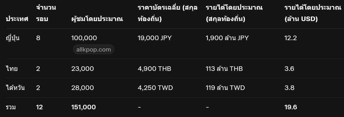 สรุปยอดการขายบัตร Fan Concert ในแต่ละประเทศ
