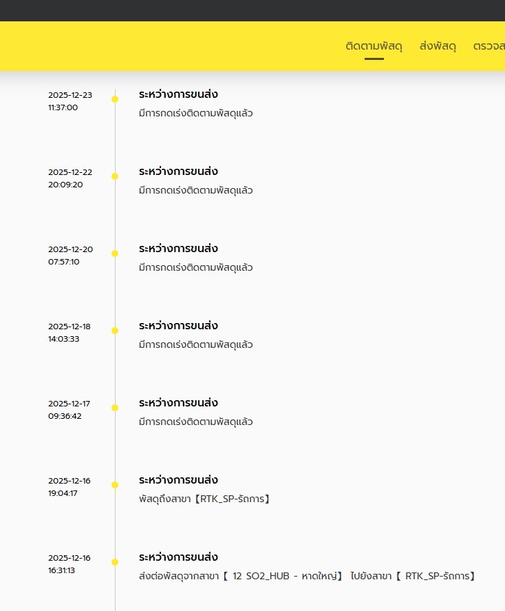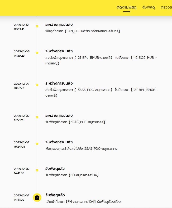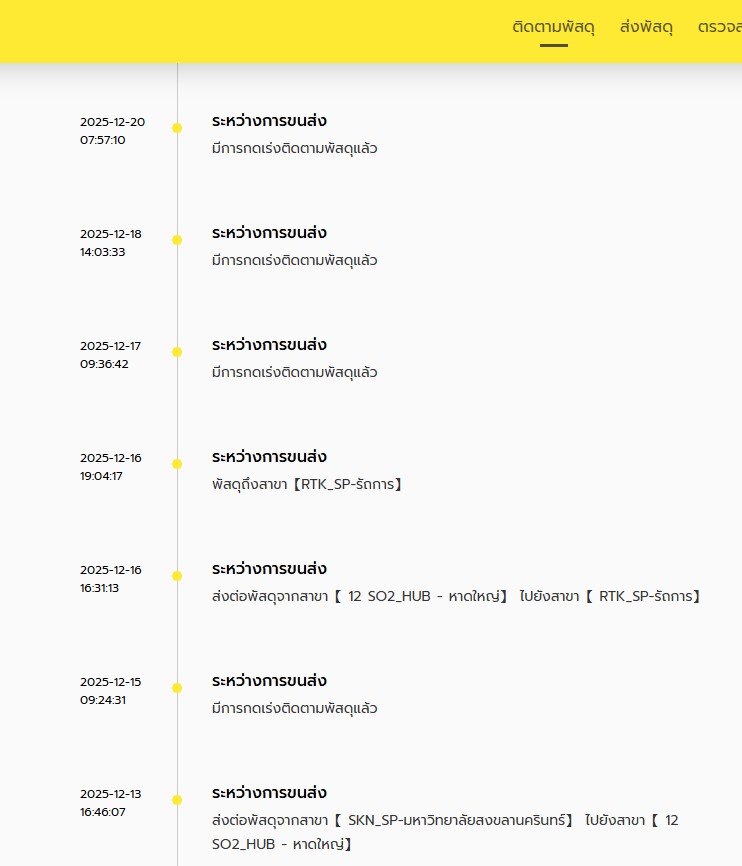 ขนส่งเข้ารับของ TH200384VSCS6C เมื่อวันที่19 ธ.ค 2568แล้วขึ้นว่ามาถึงสาขาหนองใหญ่ ชลบุรี วันที่20ช่วงเที่ยง วันนี้วันที่ 23 แล้ว ยังไม่มีการอัพเดท ว่าจะส่งถึงปลายทางเลย เบอร์ติดต่อก็ไม่มี โทรหาคอลเซนเ