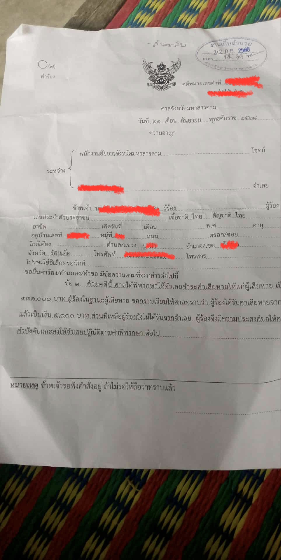 หมายศาลอุธรณ์นัดฟังคำพิพากษา