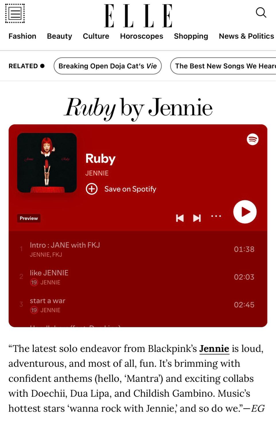 นิตยสารชื่อดังอย่าง Rolling Stone ได้จัดอันดับอัลบั้มที่ดีที่สุดในปี 2025 และอัลบั้มเดบิวต์ของ JENNIE อย่าง “Ruby” ก็ได้รับเลือกให้เป็นหนึ่งในนั้น และยังเป็นอัลบั้มของศิลปิน K-POP เพียงคนเ