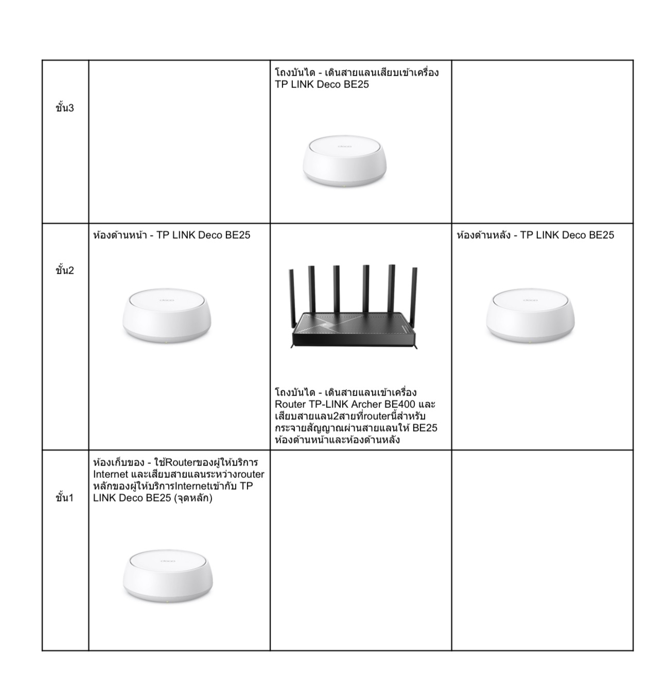 บ้านที่เราอยู่จะเป็นทาวน์เฮ้าส์ จุดหลักที่จะติดตั้งrouterหลักจะเป็นชั้น1ห้องเก็บของค่ะ จะใช้routerเดิมของผู้ให้บริการinternet และจะต่อสายLanกับเครื่องTP Link Deco BE25(สำหรับMesh Wifi)
