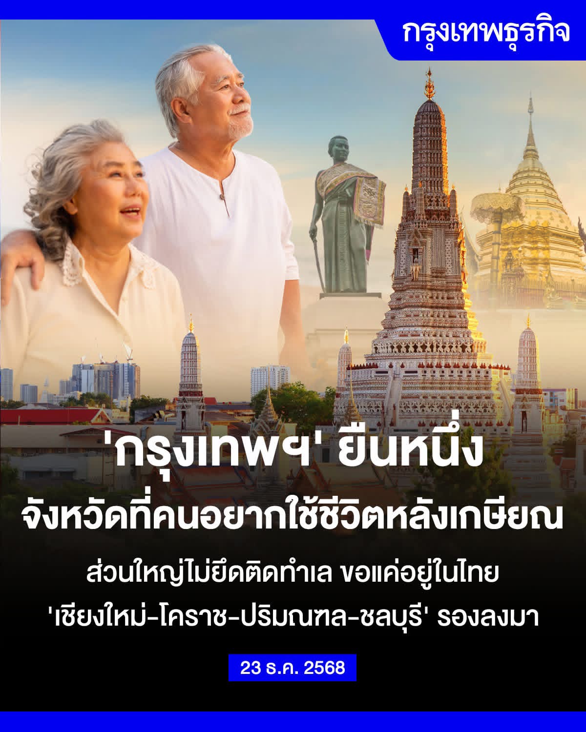 กรุงเทพฯ' ยืนหนึ่ง จังหวัดที่คนอยากชีวิตหลังเกษียณ ส่วนใหญ่ไม่ยึดติดทำเล ขอแค่อยู่ในไทย 'เชียงใหม่-โคราช-ปริมณฑล-ชลบุรี