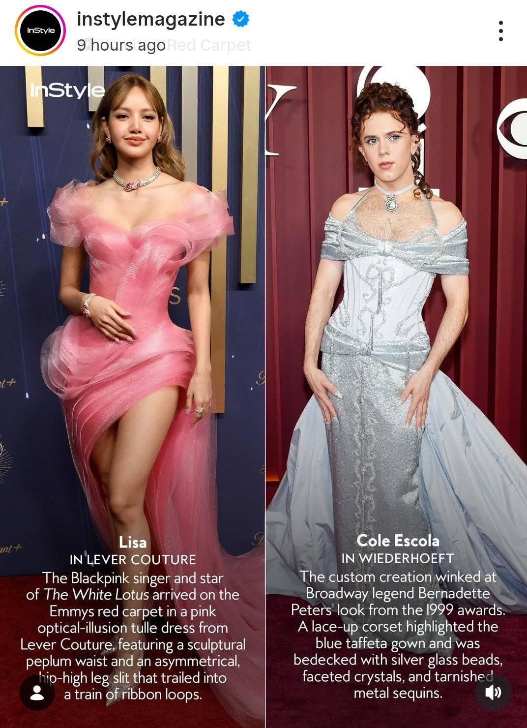 ลิซ่า สมาชิกวง BP และนักแสดงจากซีรี่ส์ The White Lotus ปรากฏตัวบนพรมแดงงาน Emmy ด้วยเดรสทูลสีชมพูจาก Lever Couture ที่สร้างเอฟเฟกต์ลวงตา (optical illusion) โดดเด่นด้วยดีไซน์ช่วงเอวแบบ peplum เชิงประติมากรรม และผ่าขาสูงแบบไม่สมมาตร ซึ่งทอดยาวต่อเนื่องไปเป็นชายกระโปรงลากที่ตกแต่งด้วยลูปริบบิ้น