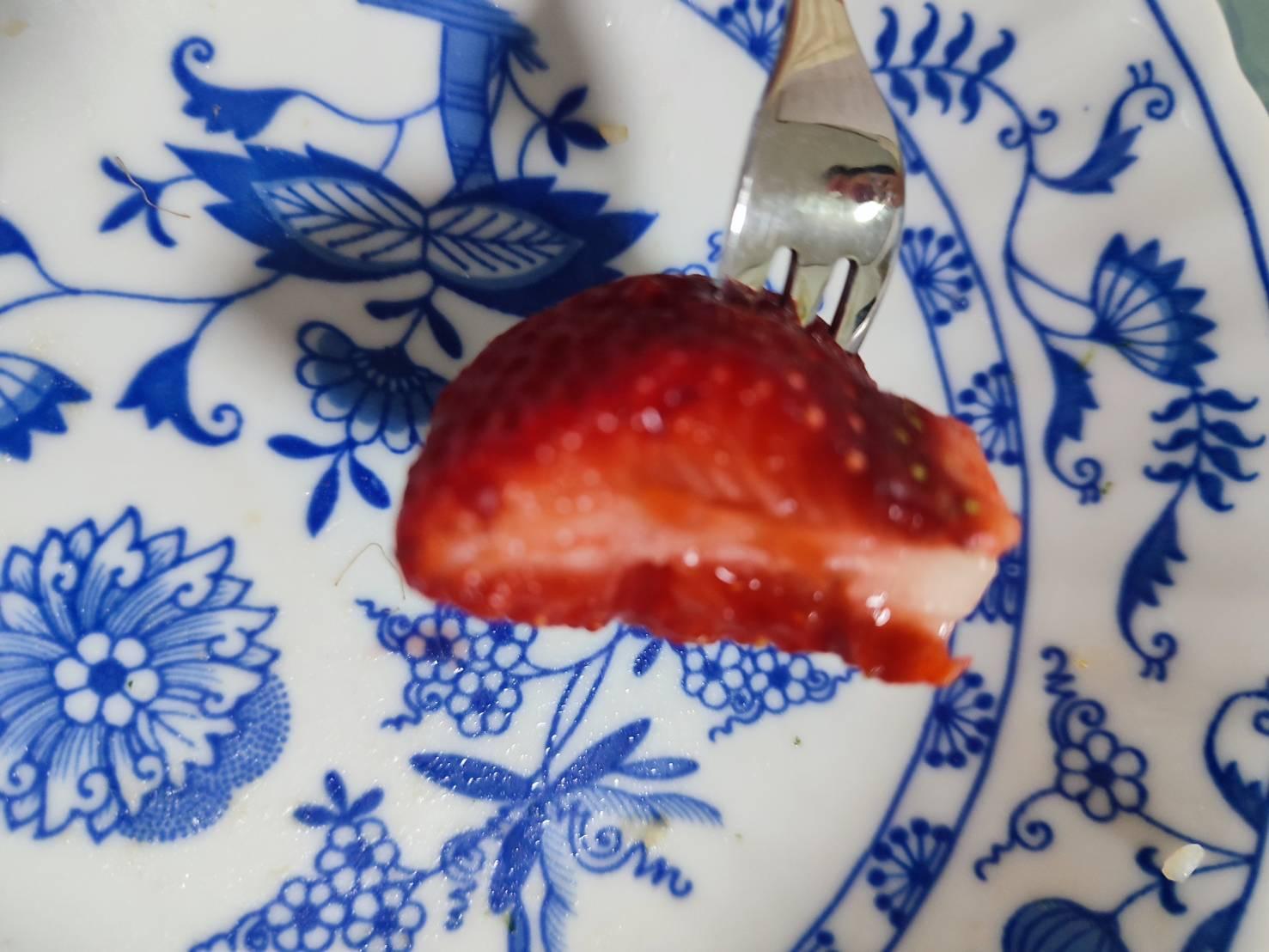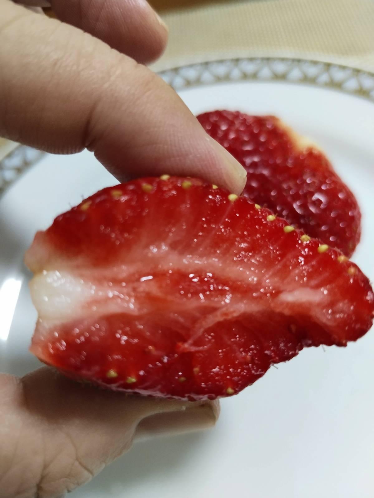 ผลไม้เป็นสตอเบอร์รี่ลูกโตมาก อามาโอะ ราชินีสตอเบอรี่ญี่ปุ่นเลยครับ หวานเจี๊ยบ แดงสดถึงข้างใน กลิ่นสตอเบอร์รี่หอมฟุ้งเลย