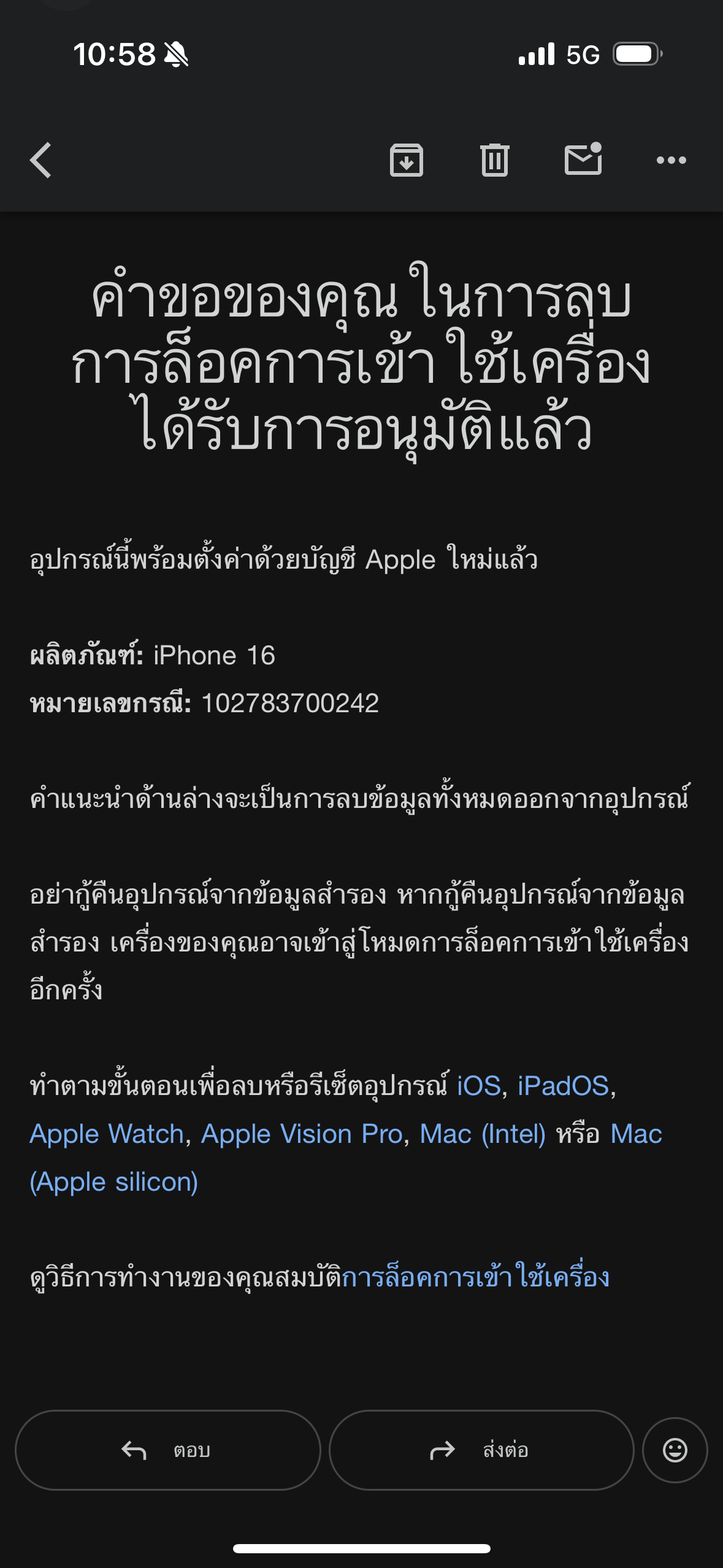 พอดียื่นคำขอลบไอคราวเดิมออกค่ะ แต่วันนั้นทางแอปเปิลให้ไปล้างเครื่อง แต่เมลส่งมาก่อน เลยอยากทราบว่า ล้างตอนนี้ยังทันไหมคะ