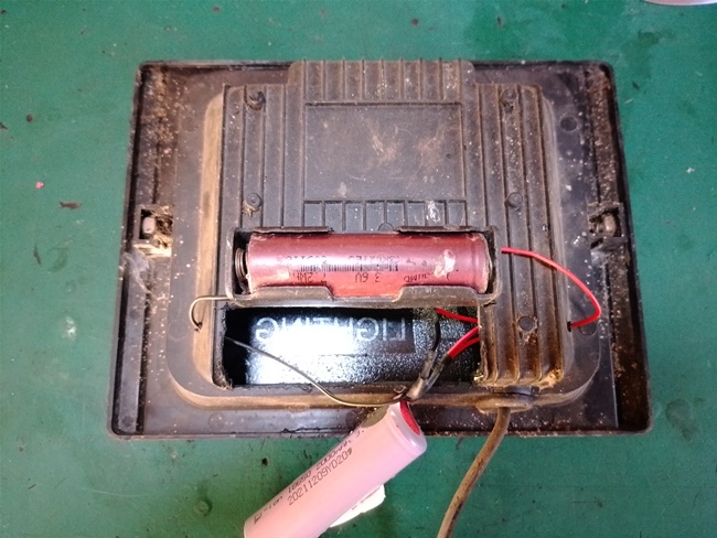 การซ่อมของผมในวันนี้จะไม่แกะกระจกโคมเพราะยุ่งยากรุ่นนี้ไม่มีพื้นที่ให้งัดหากฝืนแกะอาจทำให้กระจกแตกได้ง่ายๆ ผมไม่แกะด้านหน้าแต่ใช้วิธีเปิดช่องด้านหลังแทน จะใช้วิธีนี้ต้องรู้ตำแหน่งของแบตเตอรี่เมื่อรู้แล้วก็ใช้ไฟลนใบมีดคัทเตอร์ค่อยๆ ตัดปาดพลาสติกให้เป็นช่องพอที่จะเอาแบตเตอรี่ 18650 ออกมาได้ง่าย เนื่องจากแบตเตอรี่เดิมยังใช้ได้หลายชั่วโมงและผมก็ไม่มีแบตเตอรี่ใหม่มีแต่ของเก่าที่เริ่มเสื่อมแล้วการซ่อมจึงใช้วิธีเพิ่มแบตเตอรี่เข้าไป รุ่นนี้มีช่องว่างใหญ่จะเอาแบตเตอรี่ไปติดตั้งภายในตัวโคมเลยก็ได้แต่ผมไม่แน่ใจว่าแบตเตอรี่ของผมที่มีอยู่เซลใดดีกว่ากันจึงใช้วิธีติดรางถ่านไว้นอกโคมเพื่อให้เปลี่ยนแบตเตอรี่ได้ง่ายเหมือนเปลี่ยนถ่านไฟฉาย ผมตัดสายแล้วบัดกรีขนานเซลแบตเข้าไปโดยตรง แบตเตอรี่ที่ใช้ไม่มี BMS แต่ไม่เป็นไรเพราะโคมพวกนี้ใช้แผงเล็กๆ พลังงานในแต่ละวันก็แทบจะไม่พอชาร์จให้แบตเตอรี่เต็มอยู่แล้วจึงไม่มีอันตรายจากไฟเกิน