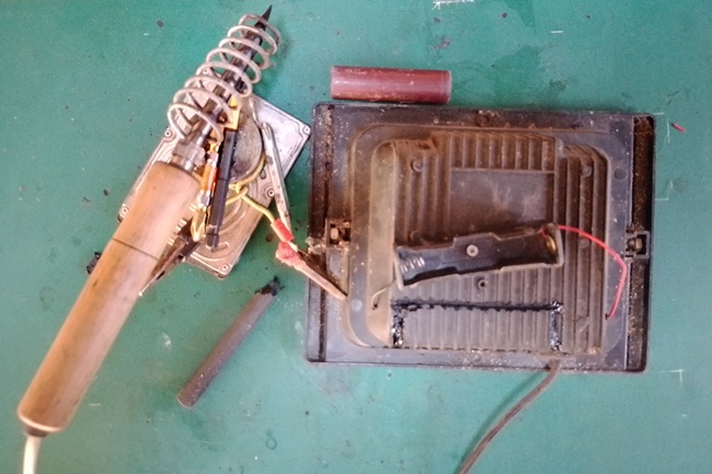 การเจาะรูยึดรางถ่านและการปิดช่องที่เปิดซ่อมผมใช้หัวแร้งซึ่งหัวแร้งด้ามนี้เป็นหัวแร้งที่ผมใช้กับกาวแท่งและพลาสติกไม่ได้ใช้บัดกรีตะกั่ว หากไม่ใช้กาวแท่งจะจี้ให้พลาสติกละลายติดกันก็ได้แต่ผมเกรงว่าฝุ่นจะเข้าไปในโคมก็เลยใช้กาวแท่งด้วยจะได้ปิดสนิท การเปิดช่องแบบนี้คราวหน้าถ้าแบตเตอรี่ด้านในเสื่อมมากๆ ก็เปิดช่องเปลี่ยนเซลแบตได้ง่ายส่วนแบตเตอรี่ที่ติดไว้ด้านหลังนั้นยิ่งเปลี่ยนง่ายกว่าหลายเท่าครับ