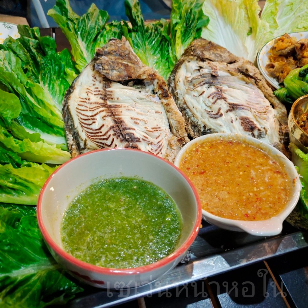 ปลานิลเผา 2 ตัวโตๆ เนื้อฟู อร่อยมากครับ น้ำจิ้มดีทั้งสองแบบ