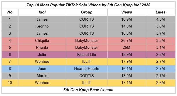 Top 10 Most Popular TikTok Solo Videos by 5th Gen Kpop Idol 2025