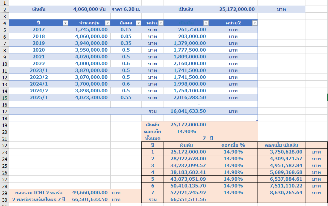 เงินปันผลที่ผมได้รับช่วง 7ปีที่ผ่านมา ลองเอามาคำนวณเป็นผลตอบแทนทบต้นครับ