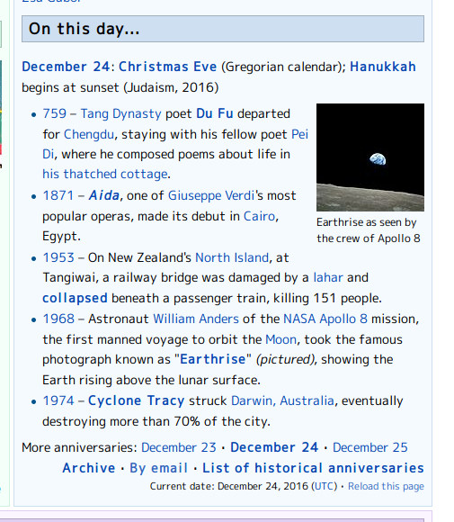 ก็มีภารกิจ อพอลโล 8 นะครับ นักบินอวกาศนามว่า William Anders เค้าถ่ายรูปนี้มาได้ ภาพนี้ชื่อ Earth rise ครับ ที่เคยอ่านมาคือเค้าอ่านข้อความใน Bible ถ่ายทอดเสียงมาที่โลก ตามความเชื่อของเค้าหละ
