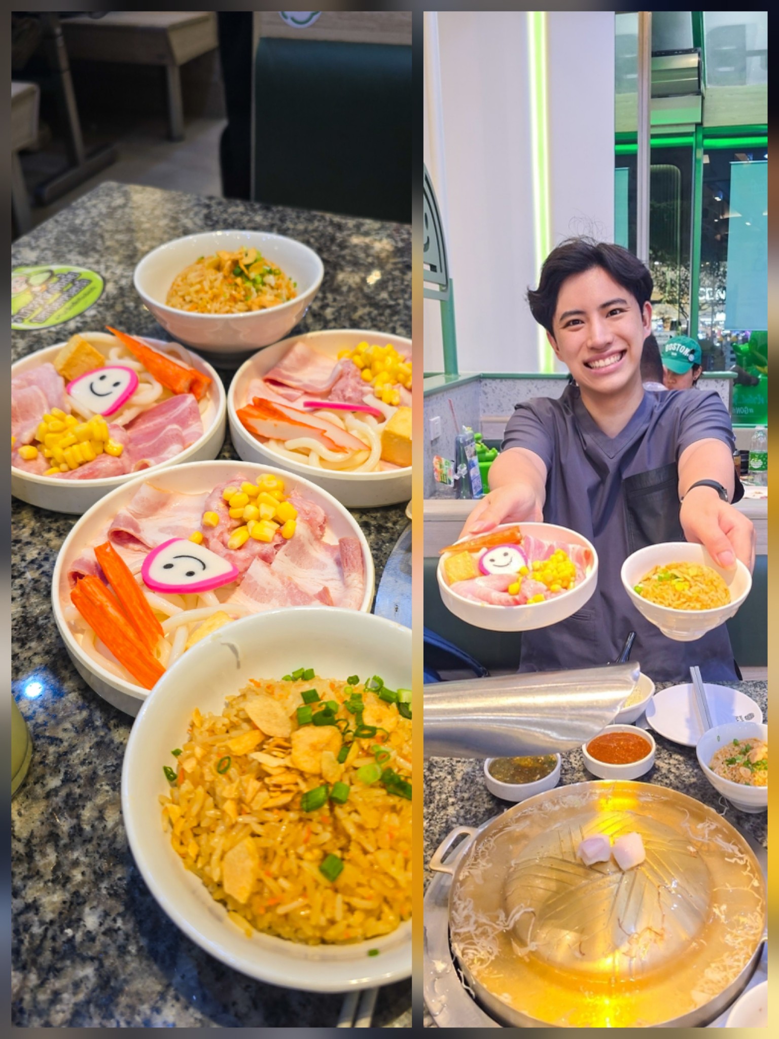 สิ่งที่ได้: 3 เซตเล็ก (มีเบคอน 4 ชิ้น, บูตะคอร์น, อุด้ง, ปูอัด, คามะจัง, เต้าหู้ปลา, ข้าวกระเทียม 1 ถ้วย) เสียดายที่ไม่ได้หมูสันคอเลยครับ