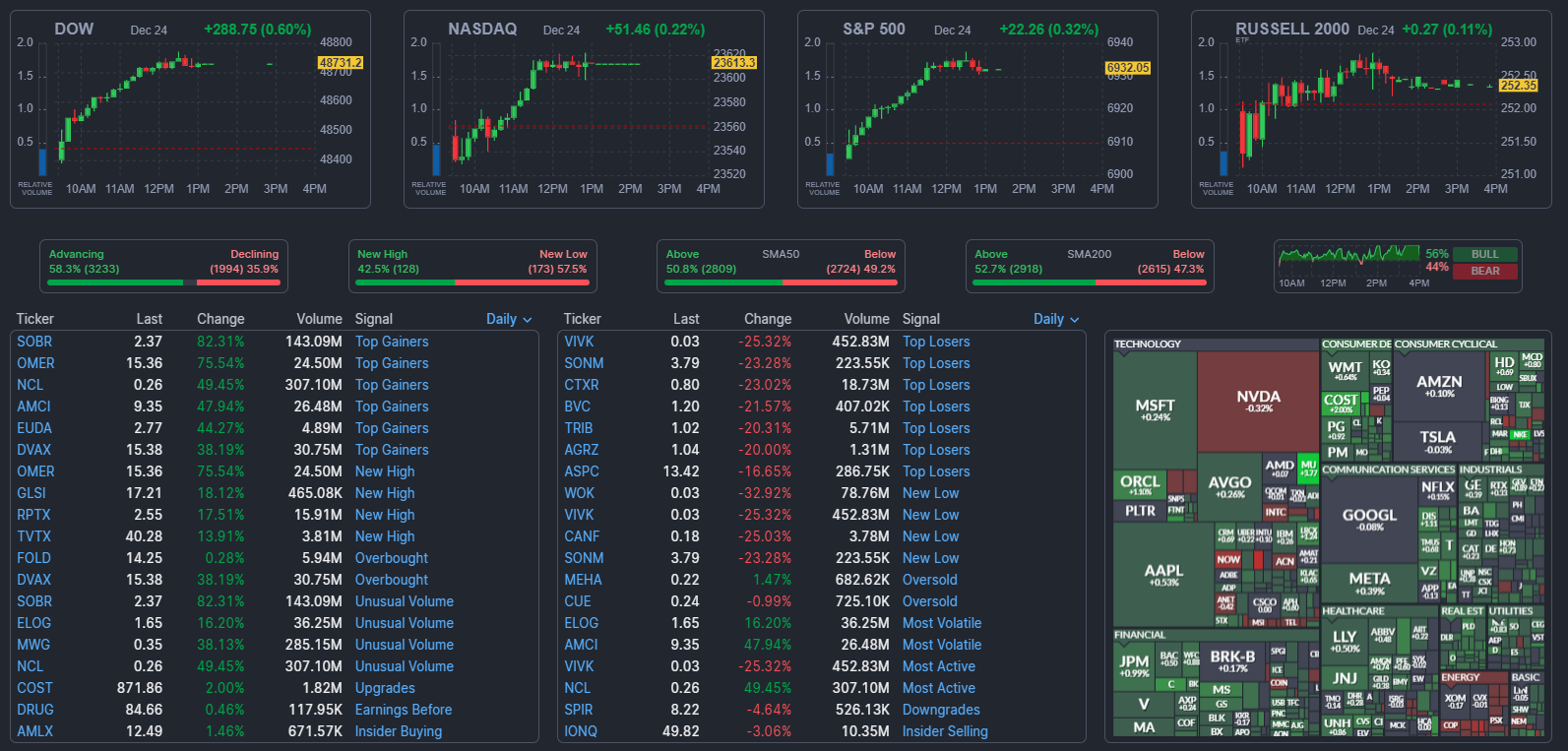 ตลาดหุ้นสหรัฐปิดการซื้อขายในวันพุธ (24 ธ.ค.) โดยดัชนี S&P 500 และดัชนีอุตสาหกรรมดาวโจนส์ปรับตัวขึ้นทำสถิติปิดสูงสุดเป็นประวัติการณ์ ขณะที่ราคาทองคำเคลื่อนไหวใกล้ระดับ 4,500 ดอลลาร์สหรัฐต่อออนซ์ ในช่วงการซื้อขายวันคริสต์มาสอีฟซึ่งมีปริมาณการซื้อขายเบาบางและใช้เวลาสั้นกว่าปกติ