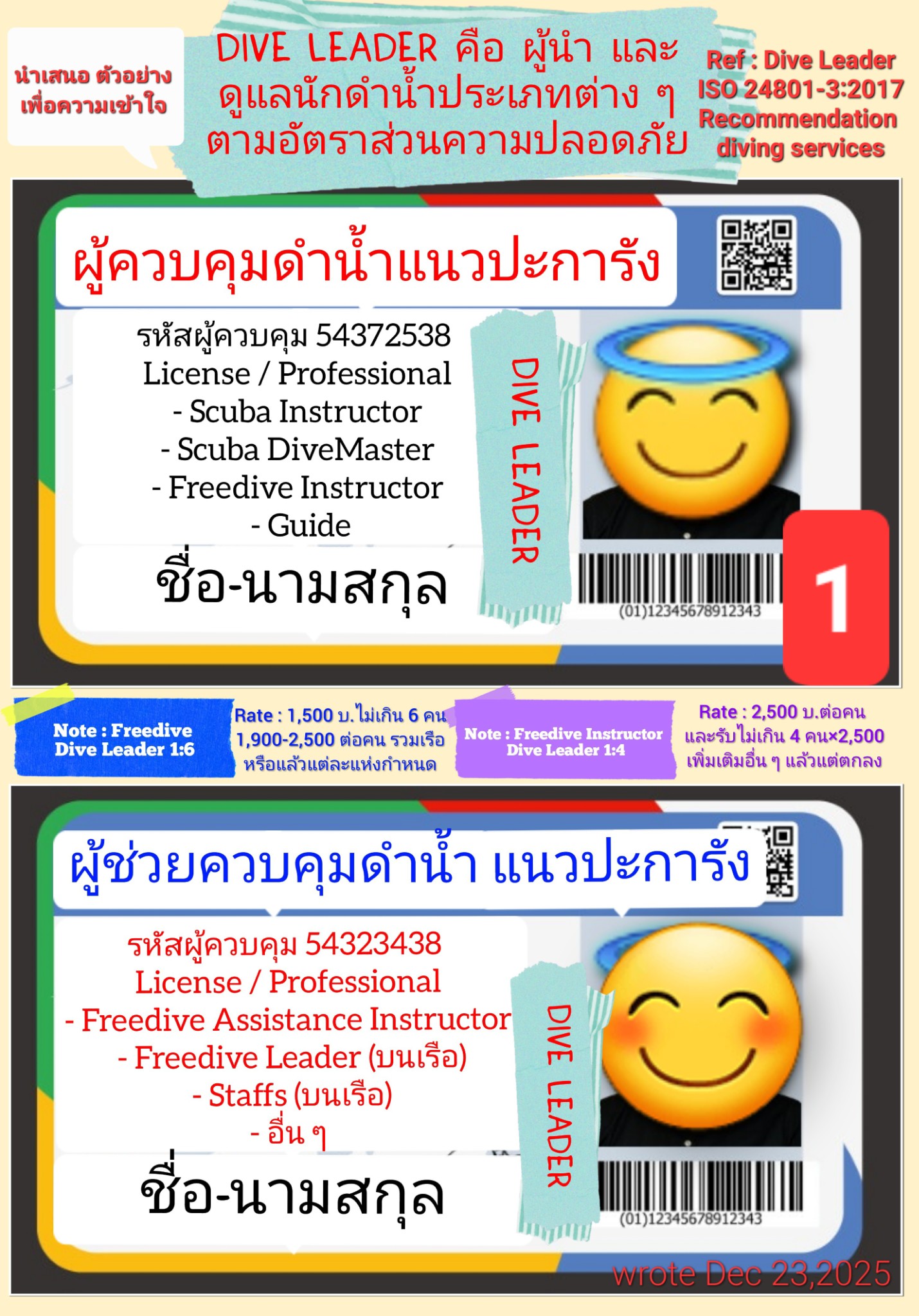 - กฎหมายผู้ควบคุม ปี 2568 , Dive Leader ตาม ISO 24801-3, และ Dive Leader, Leader ที่ถูกกำหนดคุณสมบุติ ในแต่ละพื้นที่ แต่ละหน่วยงานพื้นที่นั้นอาจทำหน้าที่แตกต่างกัน