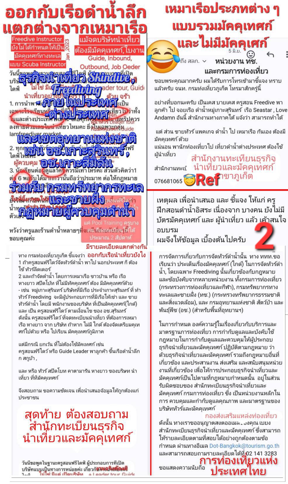 - แอดมิน ดำน้ำกันเถอะ ที่ให้พื้นที่ นำเสนอข้อเท็จจริง เรื่อง การจัดทัวร์ดำน้ำ Freediving ใครจัดได้บ้าง และ จัดแบบไหน ต้องใช้ หรือ ไม่ใช้มัคคุเทศก์ มี Job Order และจะเกี่ยวข้องกับประกันดำน้ำ จัดทัวร์ถูกต้องตามกฏหมายมีผลต่อการรับเบี้ยสินไหม หรือไม่ ,และ เรื่อง Error communicate ผู้ควบคุม ตามกฏหมาย ทช. กับ Dive Leader ประเภทต่างๆ