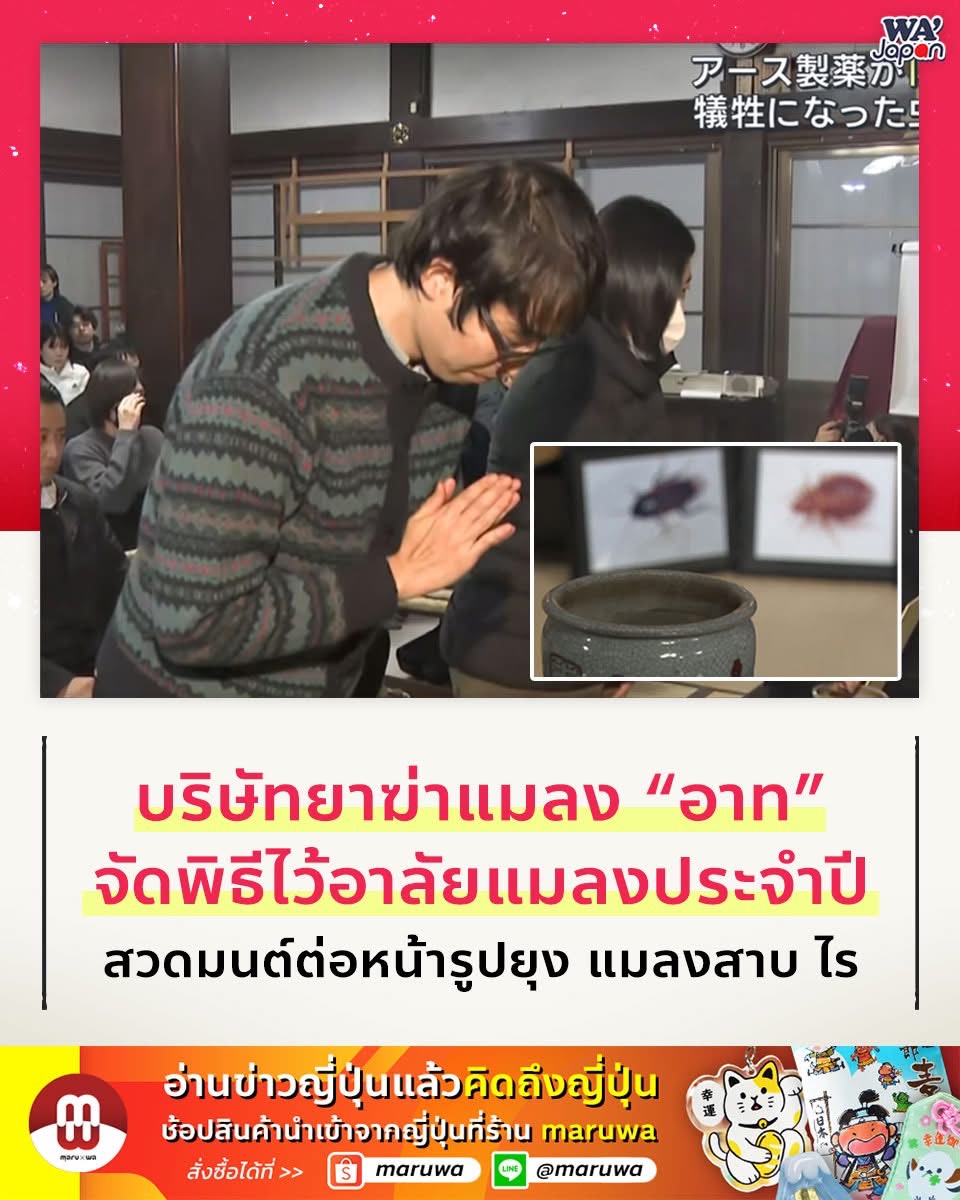 จุดธูปและสวดมนต์ส่งดวงวิญญาณ ต่อหน้ารูปภาพของยุง แมลงสาบ ไร ฯลฯ พนักงานต่างแสดงความขอบคุณต่อเหล่าแมลงที่มีส่วนช่วยในการพัฒนาผลิตภัณฑ์ให้มีประสิทธิภาพดียิ่งขึ้น