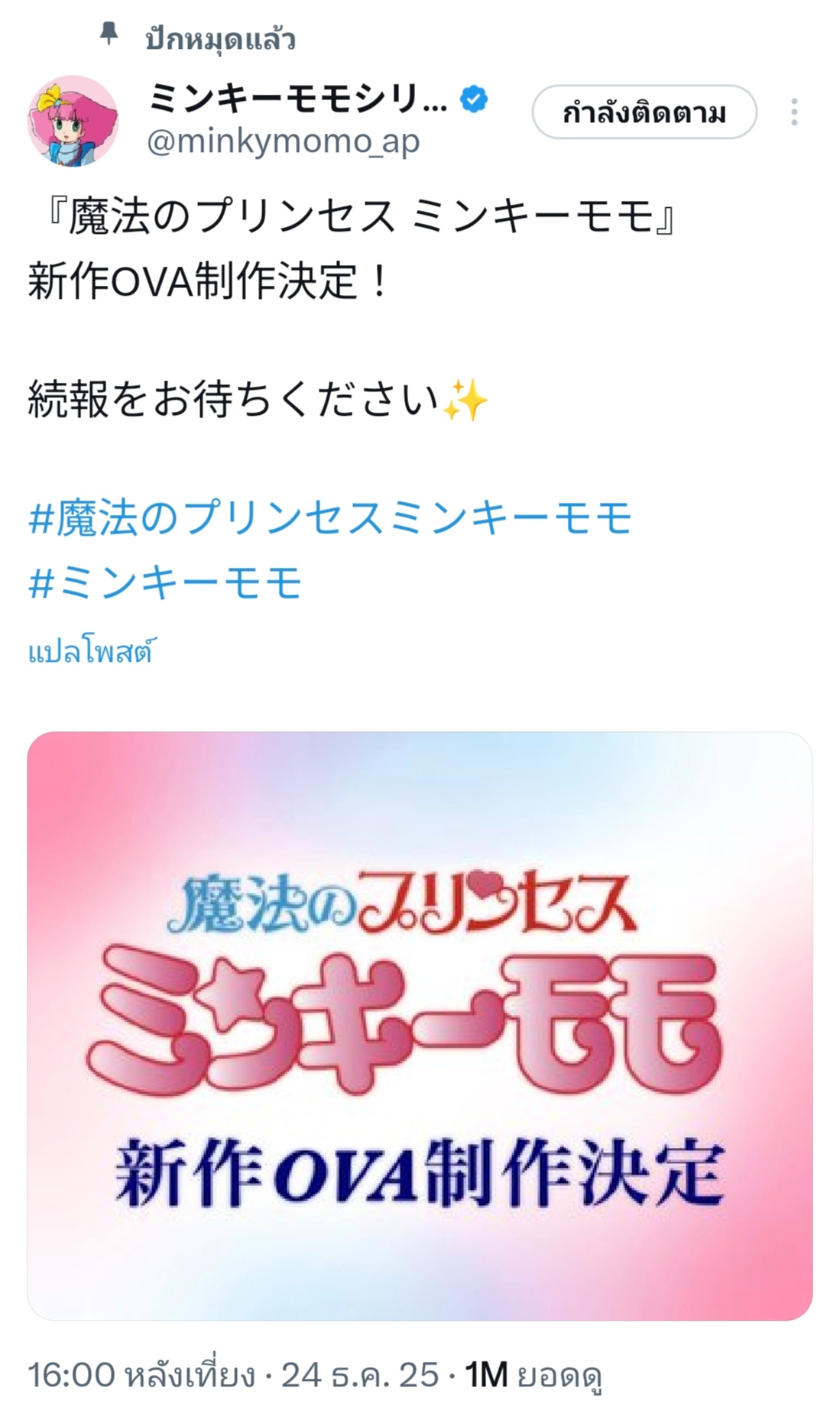 อนิเมะสายสาวน้อยเวทมนตร์ มิงกี้โมโม่ ประกาศสร้างตอนใหม่ในรอบ 31 ปี