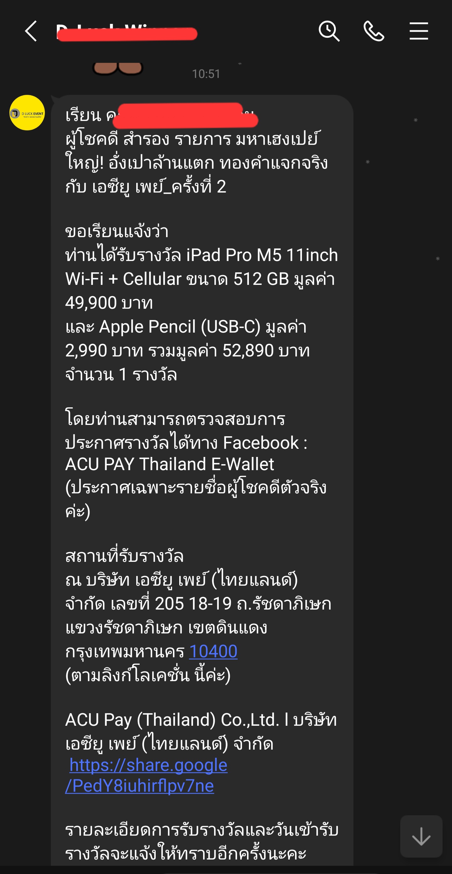 พอดี เมื่อเช้านี้ มีเบอร์โทรศัพท์แจ้งเข้ามา ว่า เราได้รับรางวัล จับฉลากลุ้นชิงโชค จากแอปAcu pay