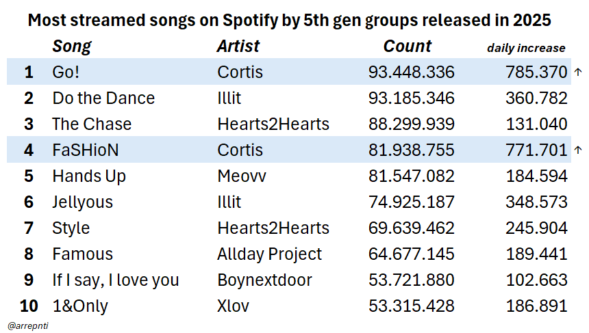 เพลง Go! ของ Cortis กลายเป็นเพลง Gen 5 ที่มียอดสตรีมมากที่สุดในปี 2025 บน Spotify!! และเพลง Fashion ก็ขึ้นมาอยู่อันดับที่ 4 แล้ว!