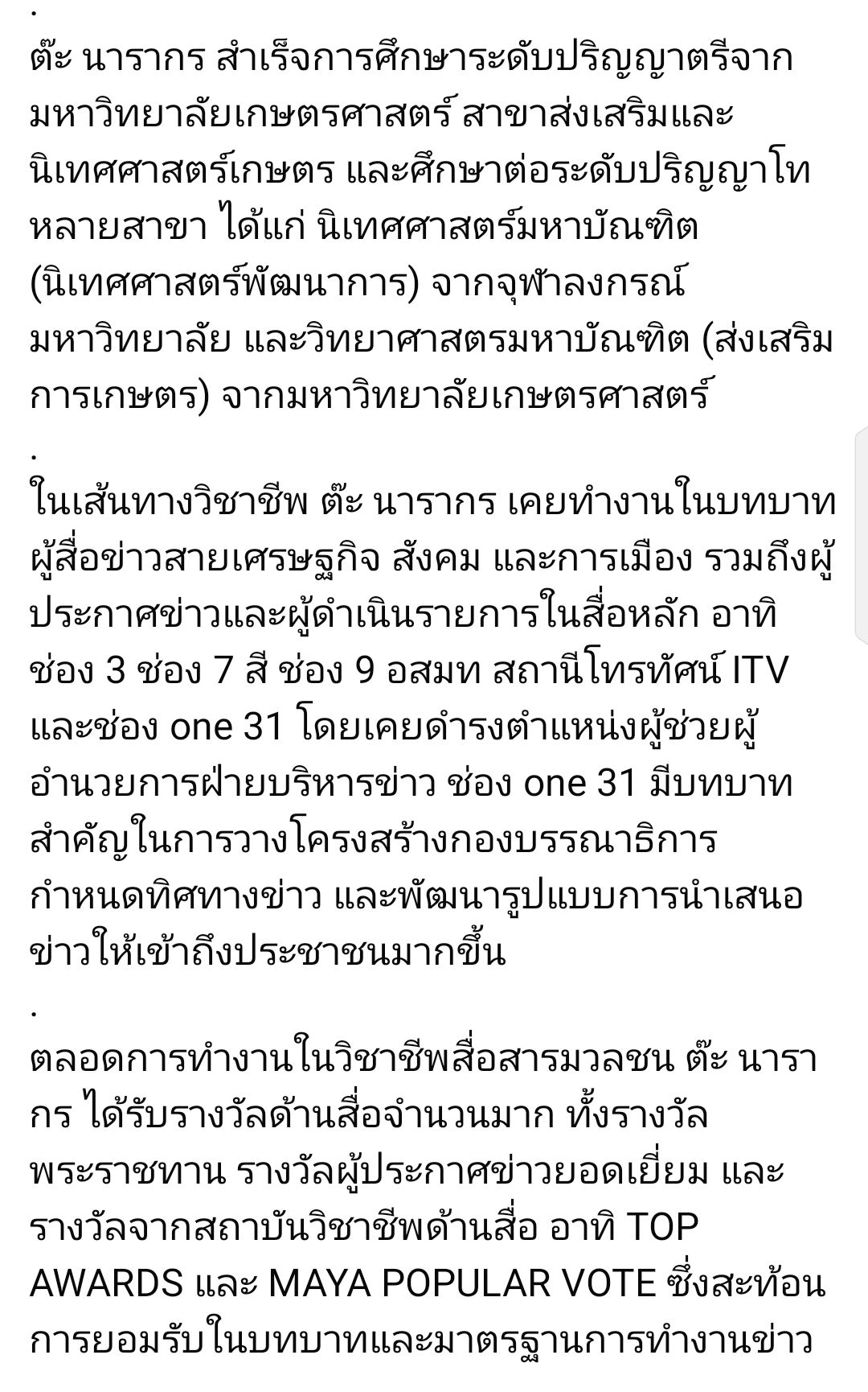 หลังผู้ประกาศข่าวคนดัง “ต๊ะ นารากร ติยายน” ลาออกจากช่องวัน ซึ่งก็ให้เหตุผลว่า เพราะทิศทางข่าวต่างกัน จึงทำให้ต้องแยกทางออกมา ล่าสุด “ต๊ะ นารากร” ได้โพสต์ข้อความปริศนาลงในเฟซ