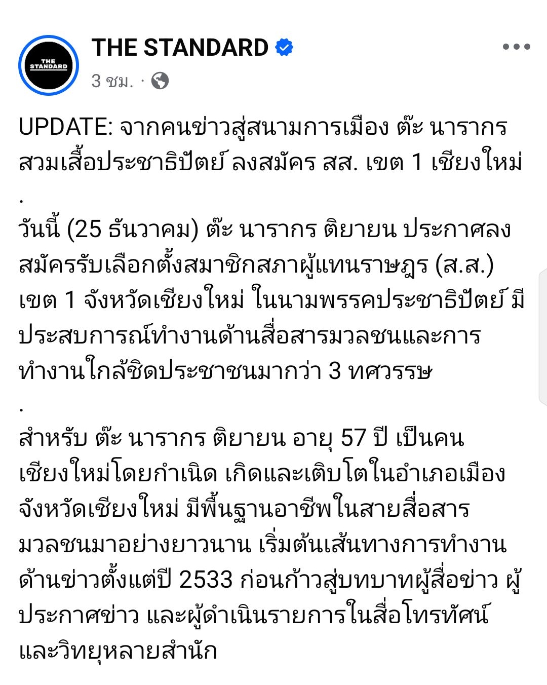 UPDATE: จากคนข่าวสู่สนามการเมือง ต๊ะ นารากร สวมเสื้อประชาธิปัตย์ ลงสมัคร สส. เขต 1 เชียงใหม่