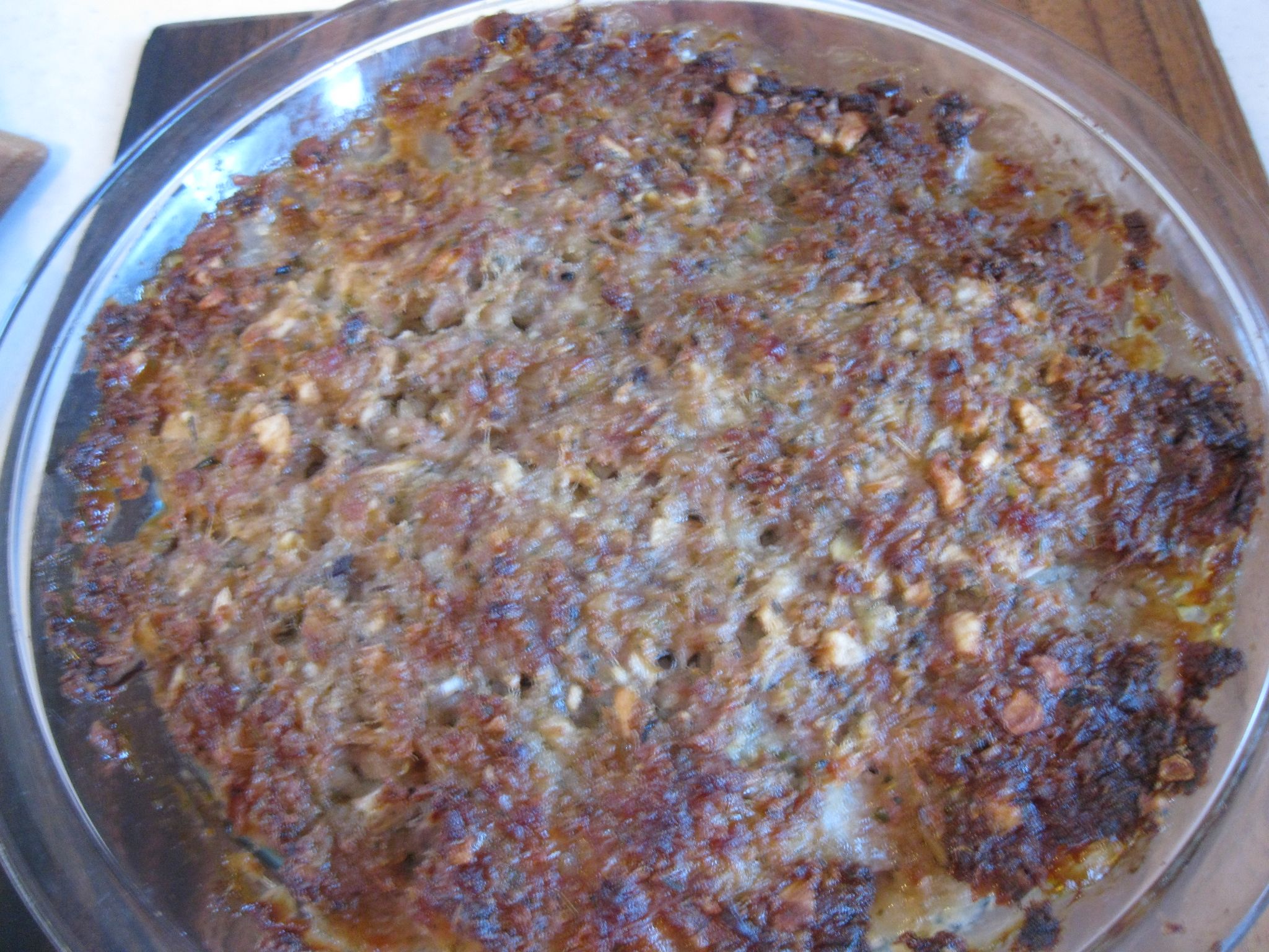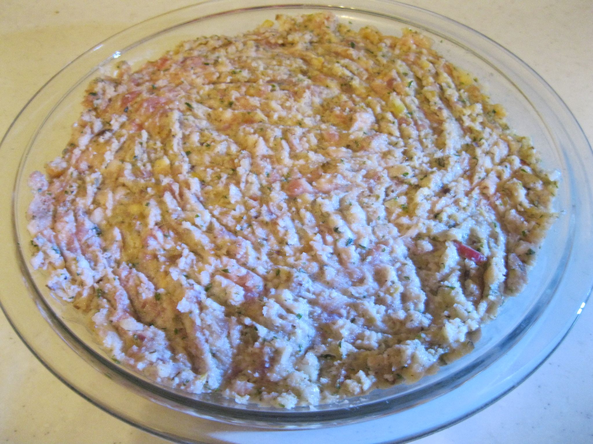 ที่ได้หั่นเป็นชิ้นเล็กๆ คลุกเคล้าให้เข้ากัน นำไปใส่ในภาชนะสำหรับอบ