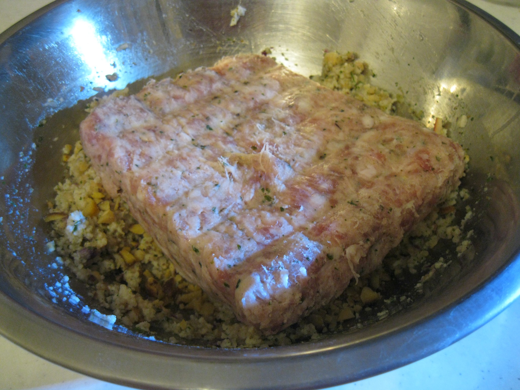 สำเร็จรูปผสมกับน้ำร้อนตามอัตราส่วนที่บอกไว้ในบรรจุภัณฑ์พักให้เย็น จากนั้นนำ sausage meat และและเมล็ดเกาลัดคั่ว