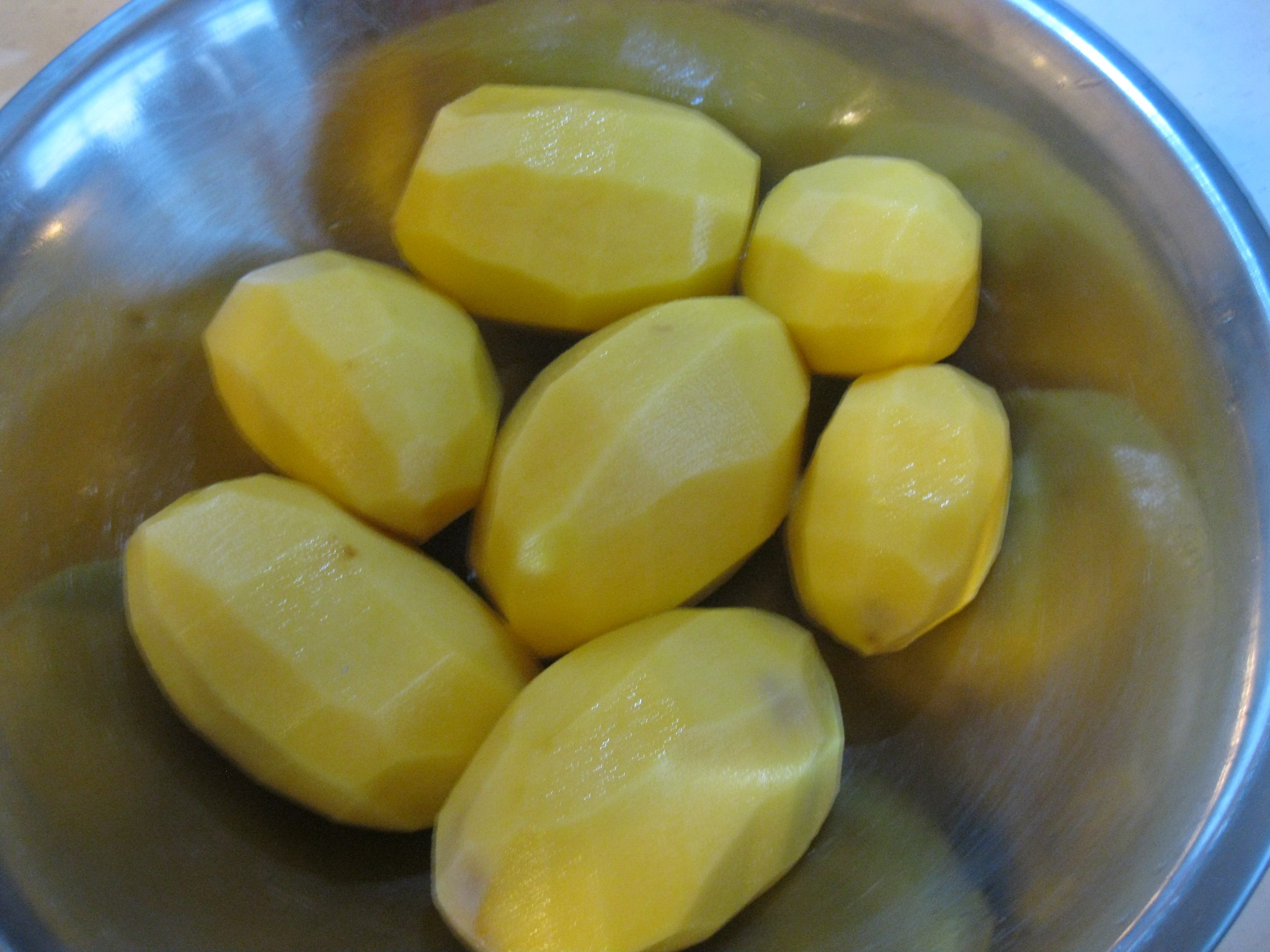 ปลอกเปลือกมันฝรั่ง ล้างหั่นให้บางขนาดตามชอบเพื่อจะนำไปทำ Dauphinoise potatoes จากนั้นให้เรียงในภาชนะจนเต็มพื้นที่