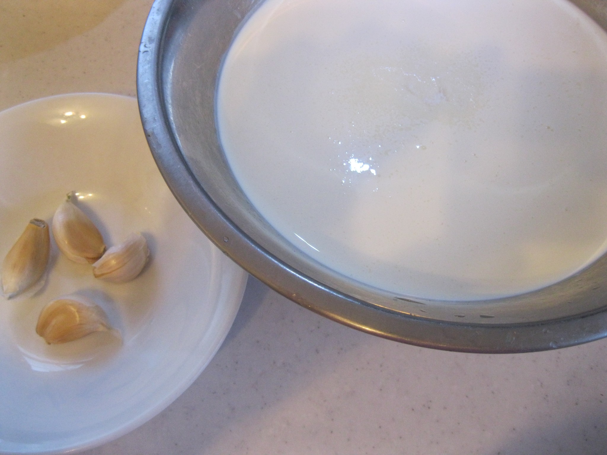 ผสม double cream นมสดจืด กระเทียมบด เและกลือป่นเล็กน้อย คนให้เข้ากัน นำไปราดให้ทั่ว ๆ แผ่นมันฝรั่ง ปิดด้วยกระดาษฟอยล์