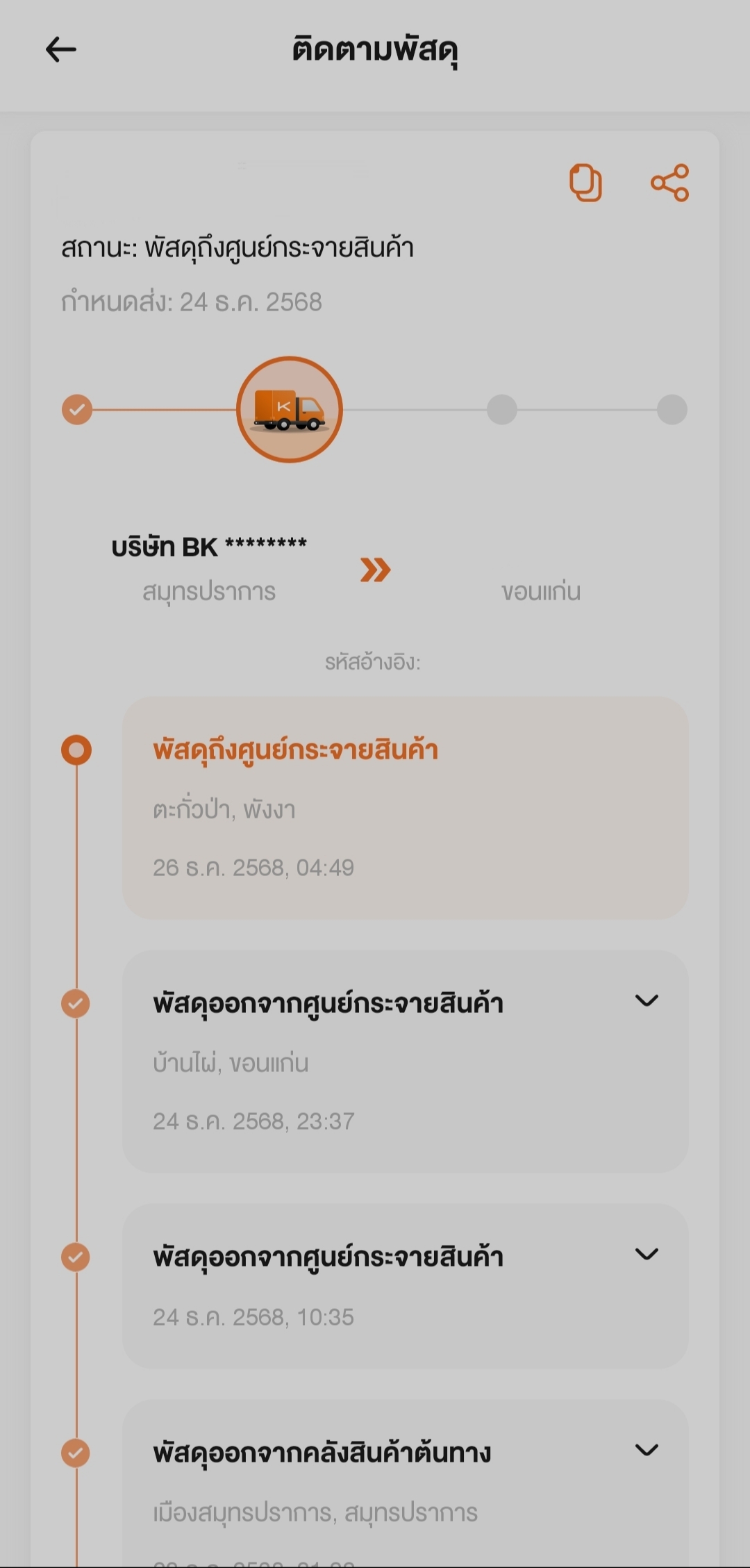 ​วันที่ 24 ธ.ค. สถานะแจ้งว่าของมาถึง "ศูนย์กระจายสินค้า บ้านไผ่ ขอนแก่น" แล้ว