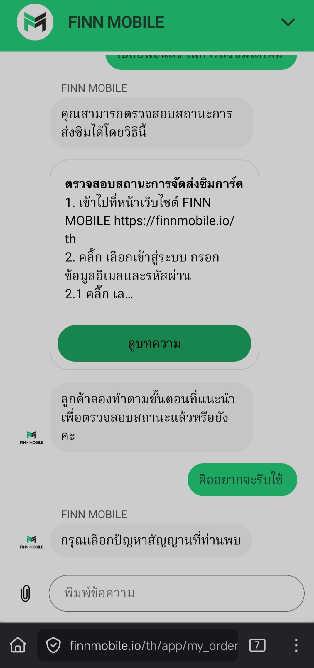 ​ทัก Support ของ FIN Mobile: ที่โฆษณาว่ามีแชท Support 24 ชั่วโมง เอาเข้าจริงมีแต่บอทตอบครับ พิมพ์แจ้งปัญหาไป เลือกเมนูไป ก็วนลูปเดิม ไม่ได้คุยกับเจ้าหน้าที่สักที