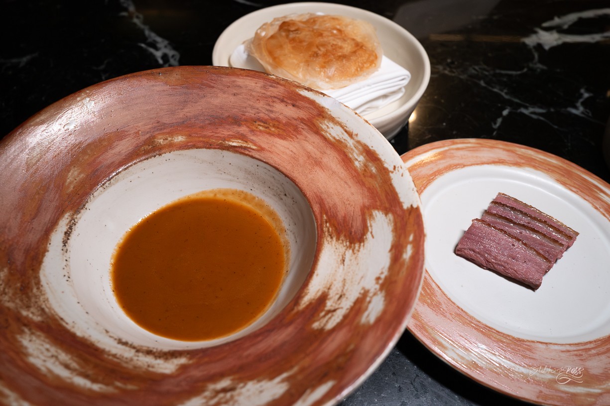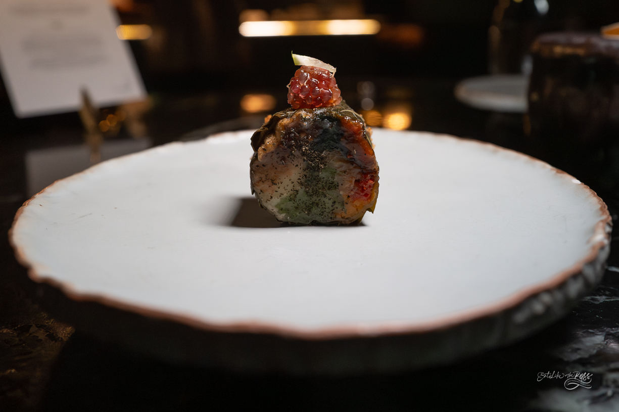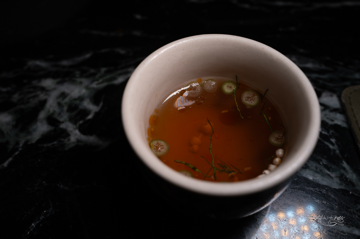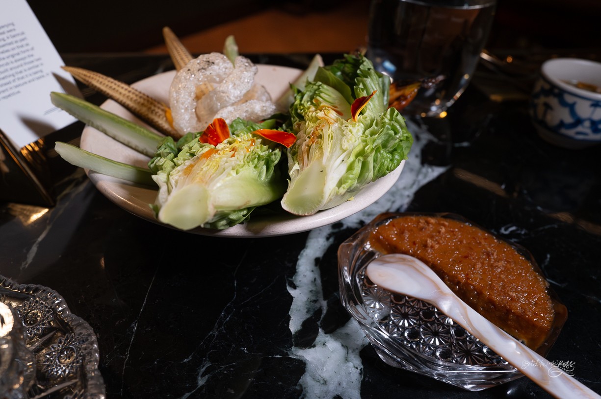 คำแรกก็ทำเอาว้าวกับแครกเกอร์กะปิที่ท็อปด้วยมะม่วง ผลไม้แช่อิ่ม และกุ้งหวาน ตัวแครกเกอร์หอมกลิ่นเนยแทรกด้วยกลิ่นอายทะเลจากกะปิ รสหวานเค็มตัดกับความเขียวของสมุนไพรอ่อนๆ เป็นกะปิหวานเวอร์ชันตะวันตก ที่รสชาตินวลเนียนและยกระดับของทานเล่นของไทย