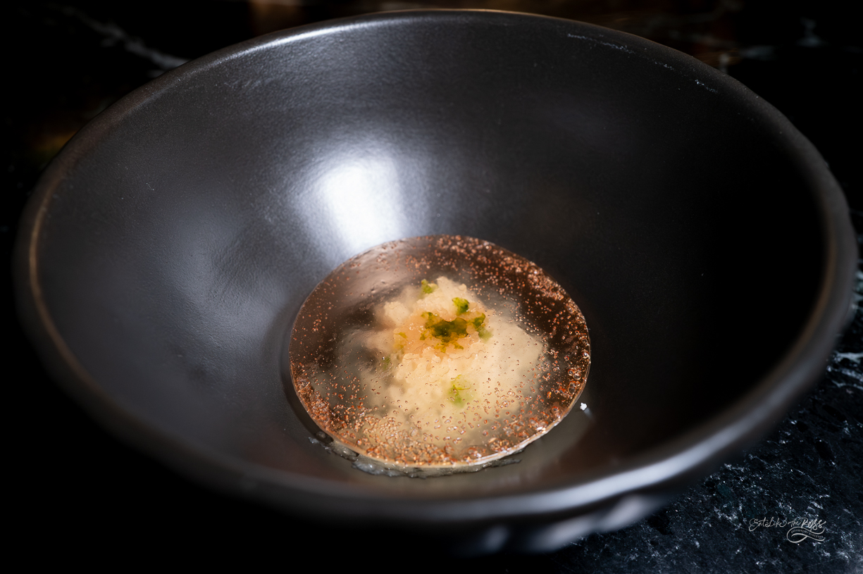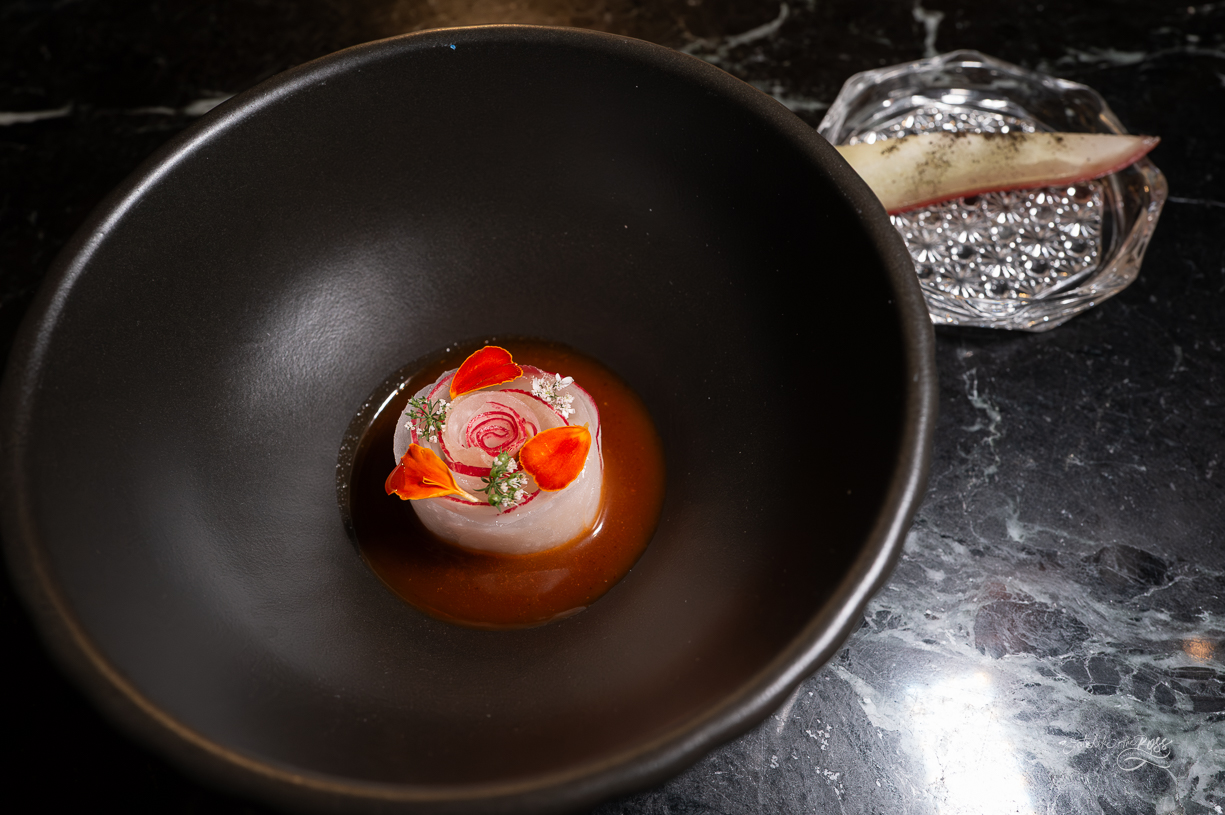 จากบทพระราชนิพนธ์ใน รัชกาลที่ 2 (King Rama II) ที่พรรณนาถึงความมันของท้องปลา 3 สู่จานที่โมเดิร์นสุดๆ เชฟใช้เทคนิคตะวันตกทำ Cold Curry Emulsion (แกงเย็น) รสเปรี้ยวหวานทานง่าย เสิร์ฟพร้อมปลา Ikejime เนื้อเด้งหนุบหนับคล้ายเยลลี่ และแฮมหมูรมควันทำเองที่ให้กลิ่นสโมคจางๆ ทานคู่กับ Rice Roti แล้วเข้ากันดีมาก