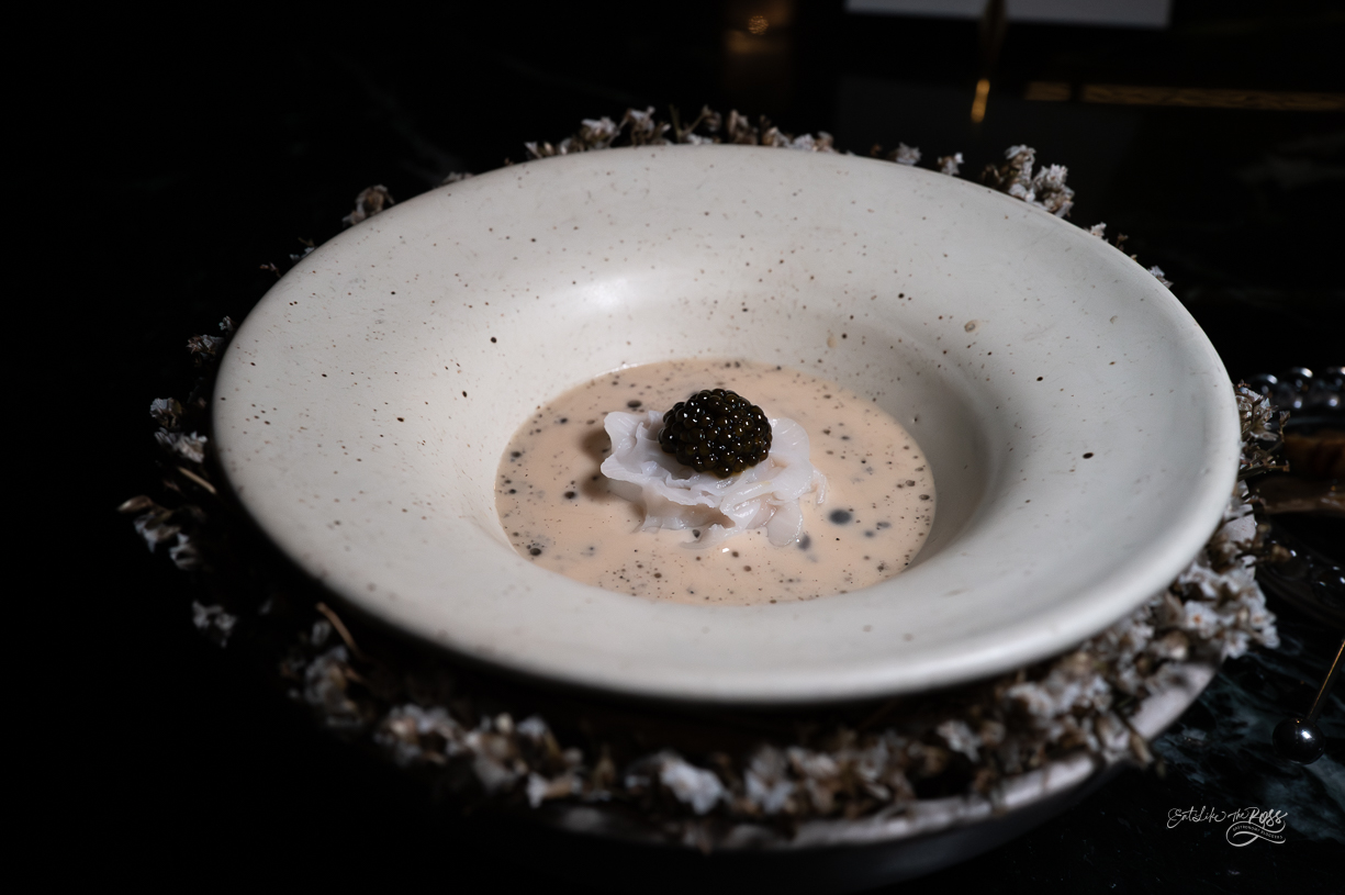 อ้างอิงจากตำรา แม่ครัวหัวป่าก์ (Maae Khruaa Huaa Bpaa) ตำราอาหารเล่นแรกของหลายๆคน โดยเชฟเลือกดัดแปลงมันมาเป็นซุปข้นสไตล์ครีมตะวันตกที่รสไม่หนักเพราะขึ้นตัวซุปด้วยกะทิ รสเปรี้ยวนำครีมมี่มะพร้าว หอมกลิ่นข่าชัดเจน ในชามมีเกี๊ยวไส้เห็ดแป้งนุ่มคล้ายราวิโอลี (Ravioli) ท็อปด้วยคาเวียร์และน้ำมันข่า ทานคู่กับเห็ดนางรมหลวงย่าง ปิดท้ายมื้อเรียกน้ำย่อยได้อย่างงดงาม