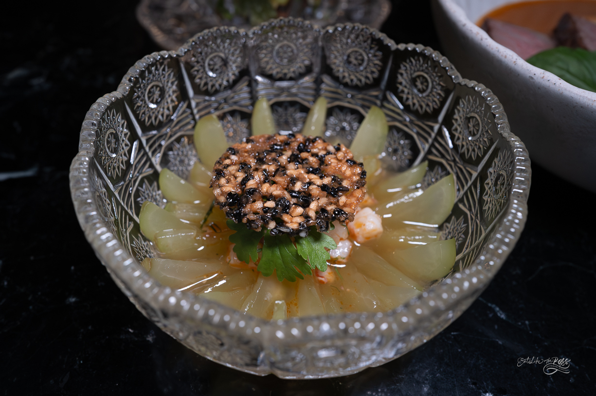 จานนี้ได้รับแรงบันดาลใจจากตำราของ ท่านผู้หญิงกลีบ มหิธร (Thanphuying Gleep Mahidhorn) ปี 1949 ที่ได้รับอิทธิพลจากพ่อครัวฝรั่งเศสในวัง ที่เริ่มนำทฤษฎีของEscoffierมาใช้ หอยเชลล์เนื้อนุ่มทานคู่กับชมพู่สดและเรดิชกรอบ น้ำยำมีกลิ่นพริกเผานำ เผ็ดร้อนเบาๆไม่เผ็ดจัด มีกลิ่น Earthy บางๆ จากเรดิช ปิดท้ายด้วยความหวานฉ่ำของชมพู่ที่ช่วยดับร้อน เป็นจานที่ Texture ดีมาก แต่กลิ่นของ Radish นั้นอาจจะ overhelm กลิ่นที่ค่อนข้างอ่อนของชมพูไปสักนิด