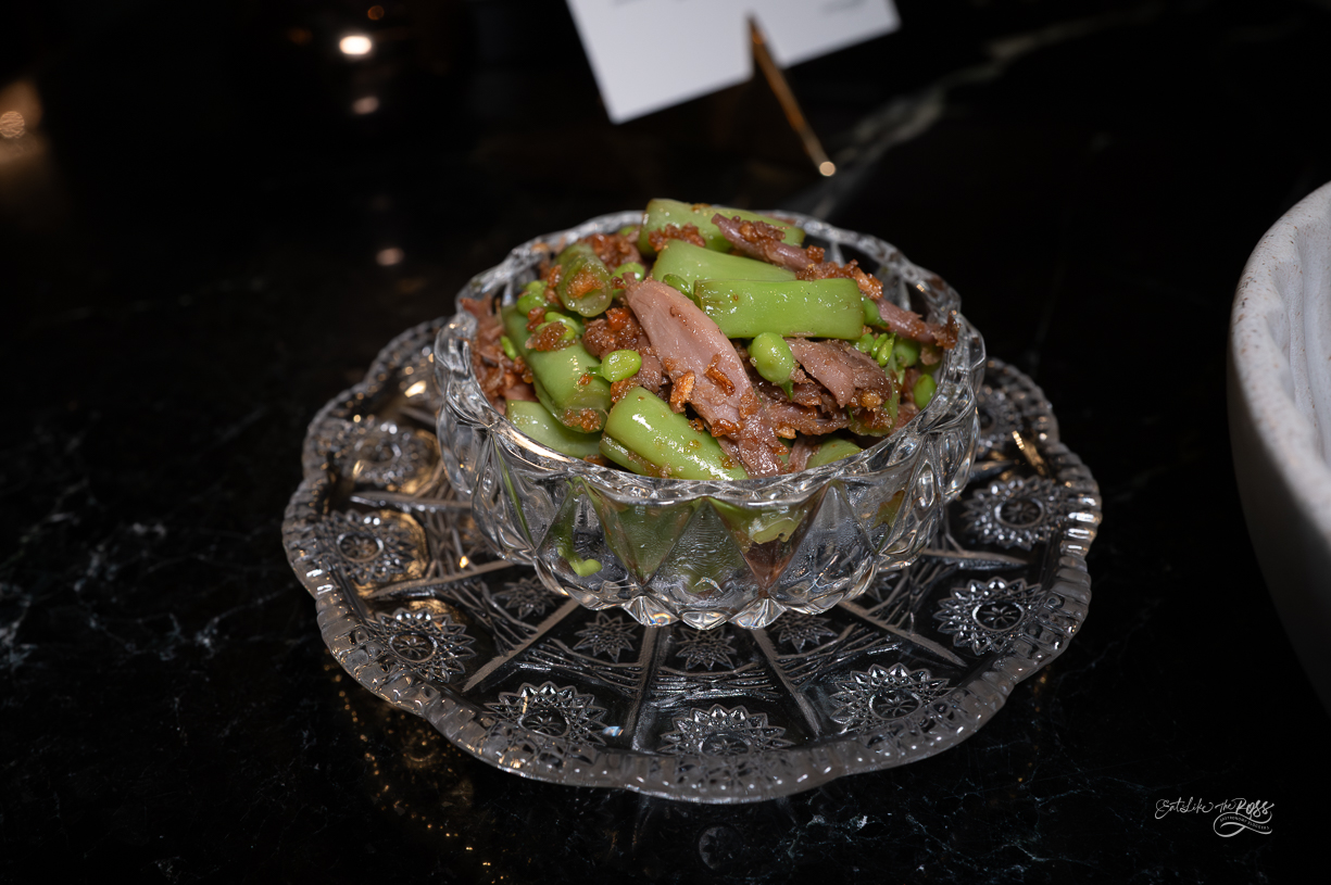 ของว่างล้านนาที่ พระราชชายา เจ้าดารารัศมี (Queen Dara Rasamee) นำเผยแพร่สู่ราชสำนักสยาม 6 มาในรูปแบบผักรวมห่อใบเมี่ยงพอดีคำ ท็อปด้วยซอสเมี่ยงและ Finger Lime (มะนาวนิ้วมือ) ที่รสเปรี้ยวโดดช่วยระเบิดความสดชื่น ตัดกับรสหวานและกลิ่นหอมเฉพาะตัวของใบเมี่ยงดองที่ใช้ห่อด้านนอก รสผักที่หลากหลาย สัมผัสที่มีมิติยุบยับ ความสดชื่นและไม่รู้สึกหนักหวานมากจนเกนไปของคำนี้ เป็นคำที่ผมเรียกได้เต็มปากว่าเมี่ยงแต่มีการยกระดับในแบบตะวันตก และสร้างมิติรสชาติที่สนุกสนานได้อย่างยอดเยี่ยม