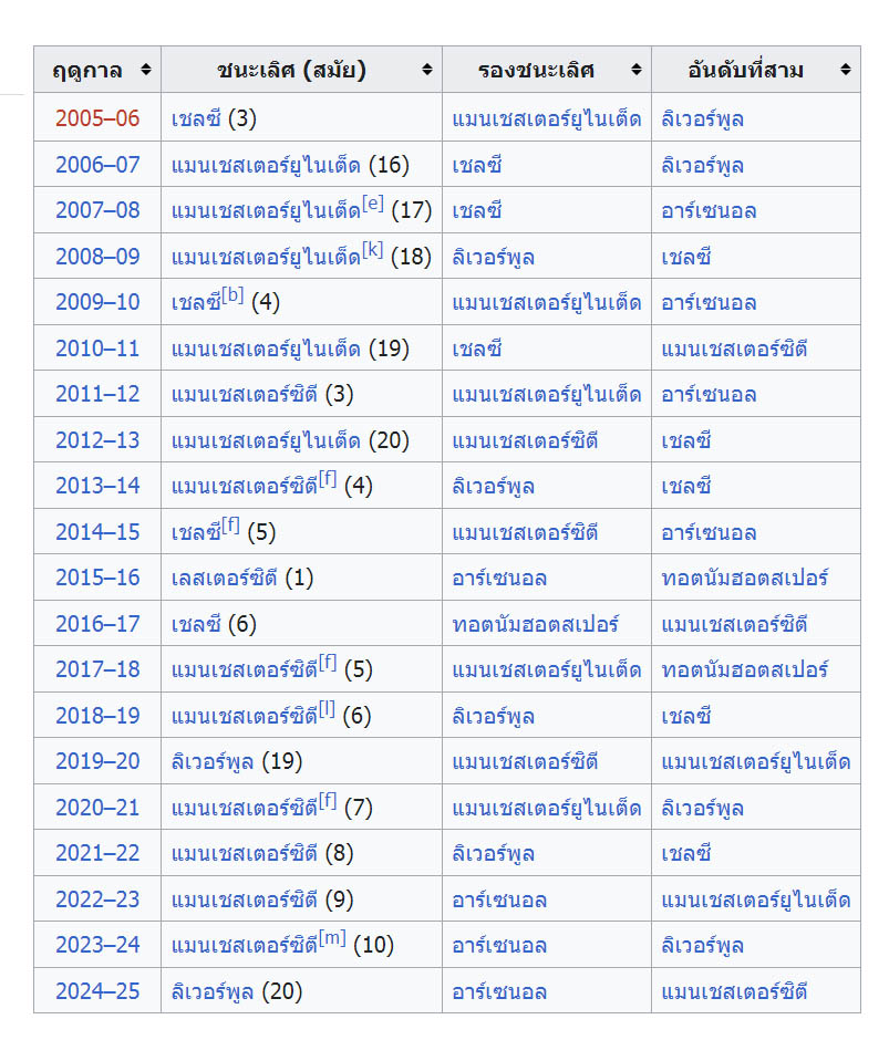 ทำเนียบแชมป์พรีเมียร์ลีกอังกฤษย้อนหลังไป 20 ปี คุณเห็นอะไรบ้าง
