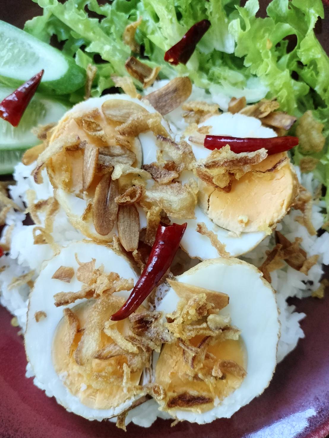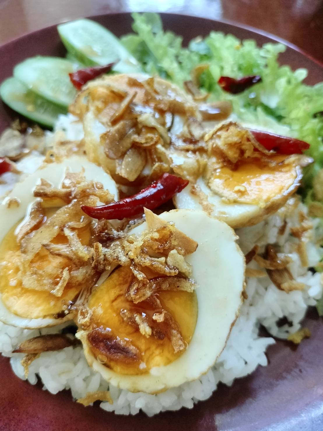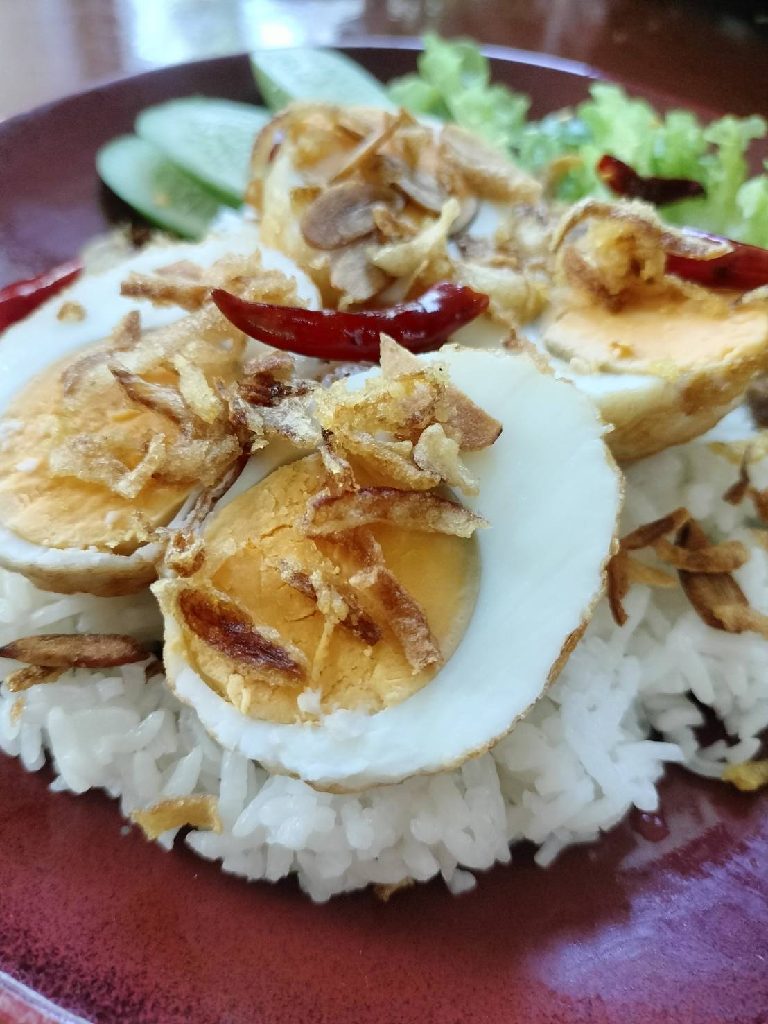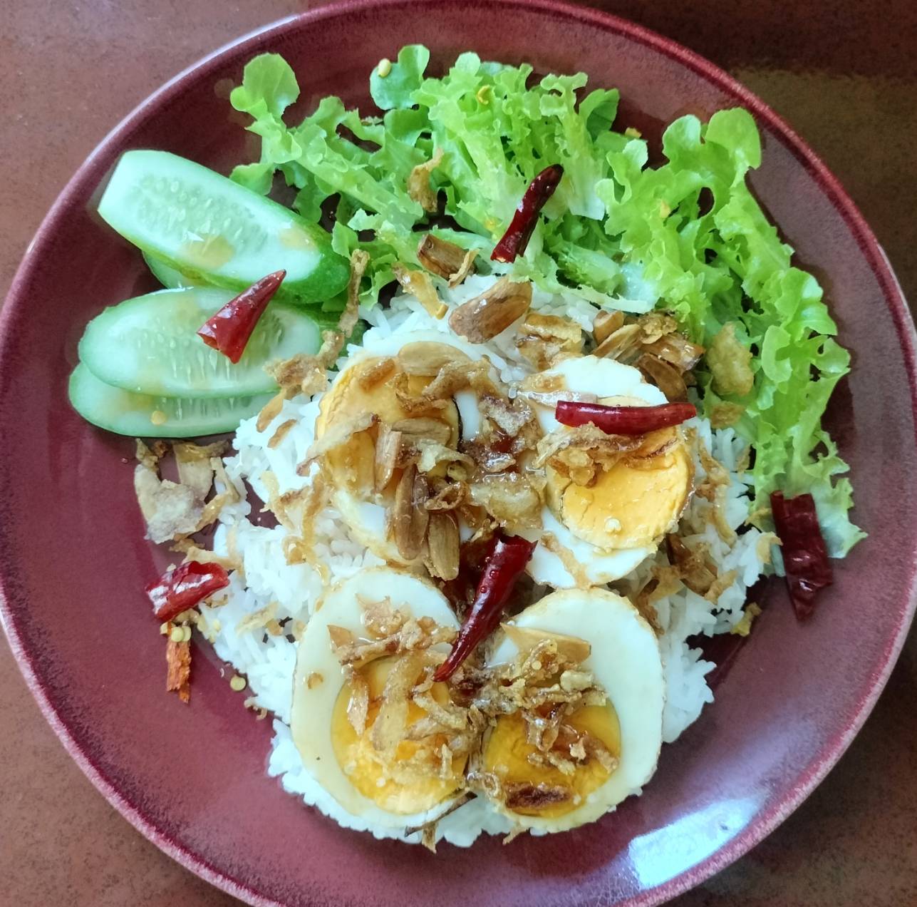 อุ่นข้าวให้ร้อนแล้วจัดลงจานพร้อมไข่ แต่งด้วยผักสดที่มีและเครื่องที่แถมมากับน้ำปลาหวาน
