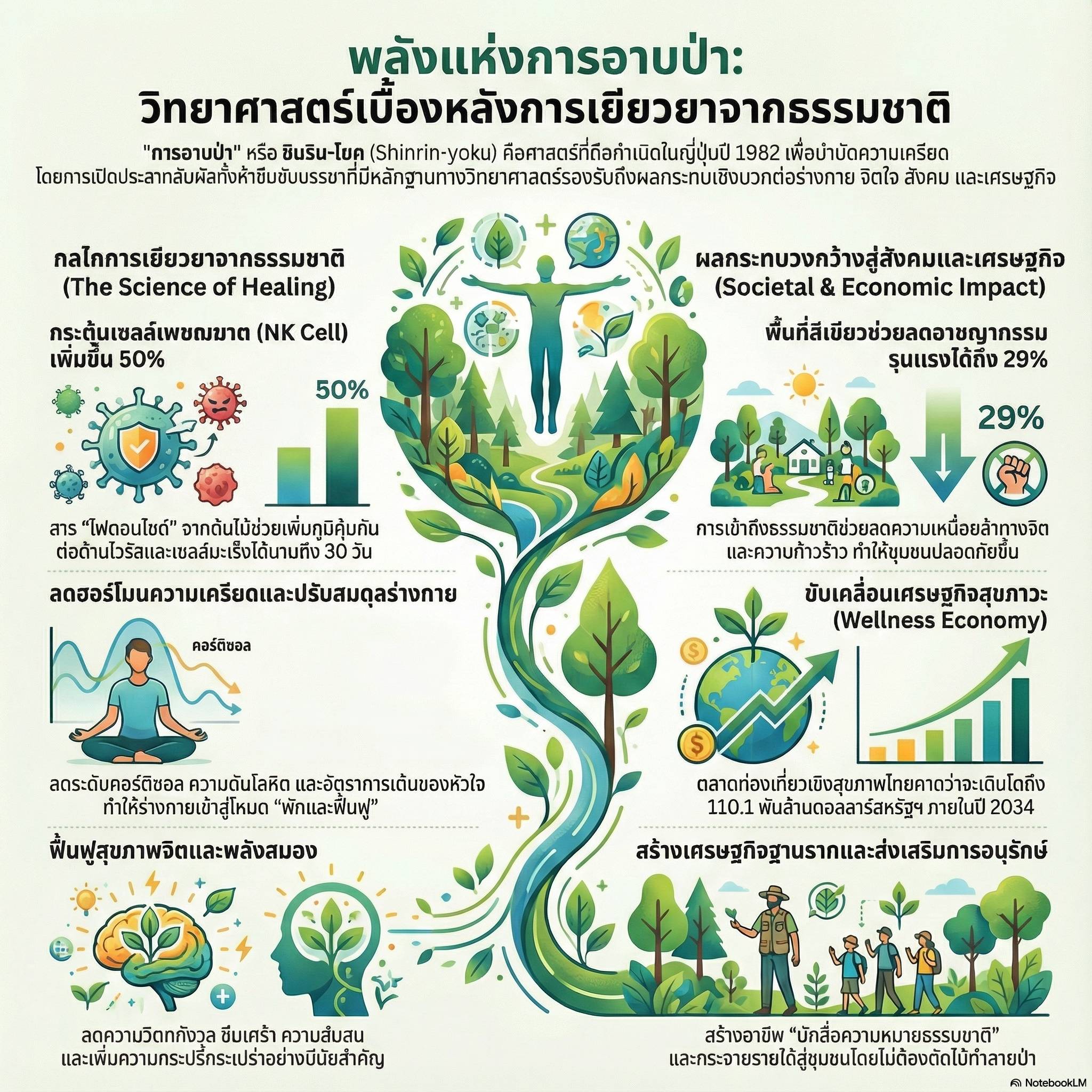 ประโยชน์ของการอาบป่ามีหลายด้าน โดยงานวิจัยหลายฉบับชี้ให้เห็นว่าการอาบป่าช่วยลดระดับคอร์ติซอล (ฮอร์โมนความเครียด) ลดความดันโลหิต และทำให้อัตราการเต้นของหัวใจต่ำลง ส่งผลให้ร่างกายและจิตใจอยู่ในสภาวะที่ผ่อนคลายมากขึ้น (Park et al., 2010) นอกจากนี้ การอยู่ในป่ายังช่วยเพิ่มการทำงานของระบบภูมิคุ้มกัน โดยเฉพาะการกระตุ้นเซลล์ NK (Natural Killer Cells) ซึ่งเป็นเซลล์ที่มีบทบาทในการทำลายเซลล์ที่ติดเชื้อหรือเซลล์มะเร็ง ซึ่งการศึกษาพบว่าหลังการเข้าร่วมกิจกรรมอาบป่า ระดับเซลล์ NK จะเพิ่มขึ้นและยังคงสูงขึ้นเป็นเวลาหลายวัน (Li et al., 2007)