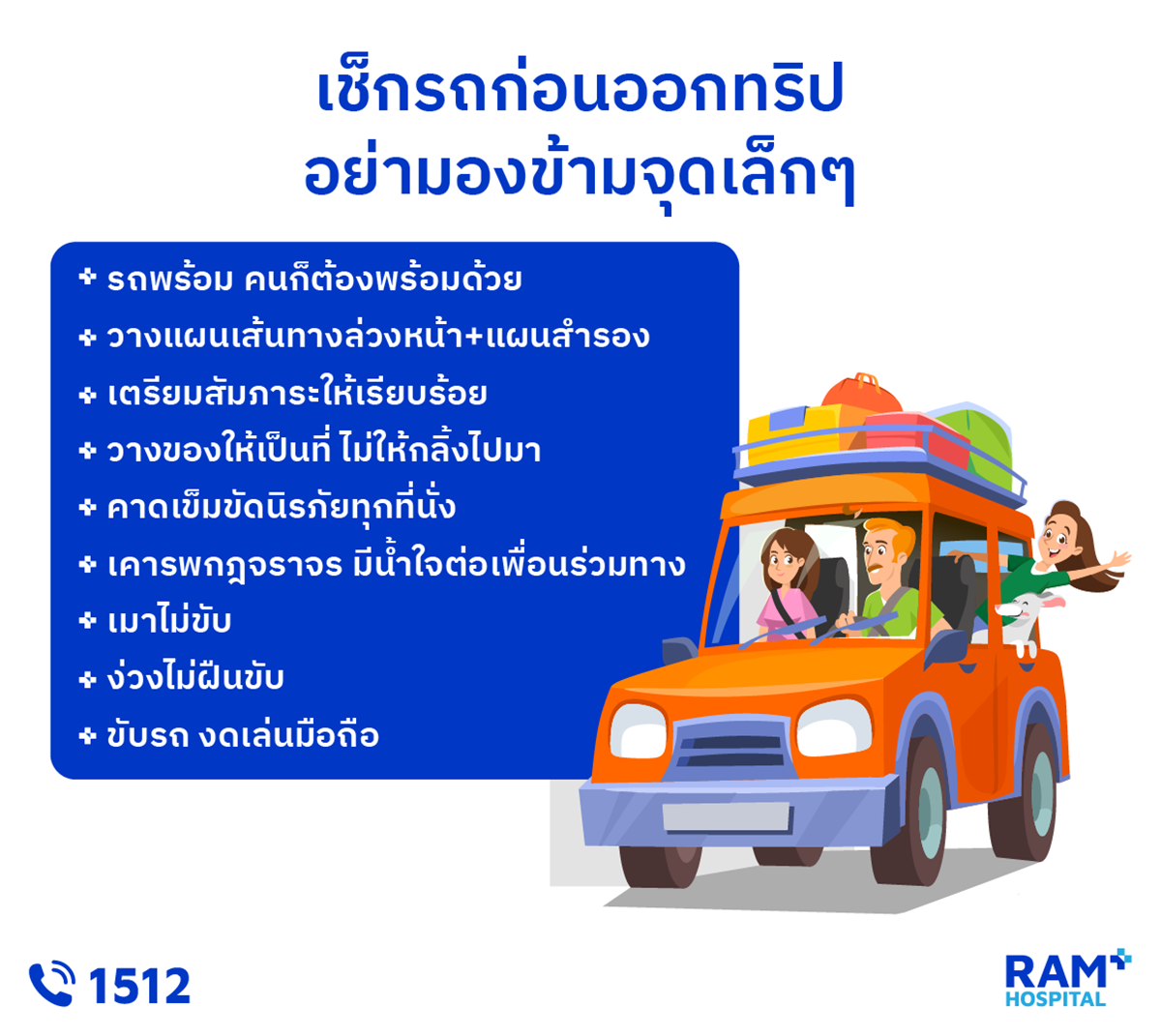 ก่อนเดินทางไกล อย่าลืมตรวจเช็กรถให้เรียบร้อย ไม่ว่าจะเป็นแบตเตอรี่ ระบบน้ำและของเหลวต่างๆ น้ำมันเครื่อง น้ำมันเบรก ระบบเบรก ไฟหน้า-ไฟท้าย-ไฟเลี้ยว ช่วงล่าง ล้อและยางรถ รวมถึงแรงดันลม ยางเช็กให้มั่นใจว่าทุกอย่างอยู่ในสภาพพร้อมใช้งาน จะช่วยลดความเสี่ยงระหว่างทางได้มากเลยค่ะ