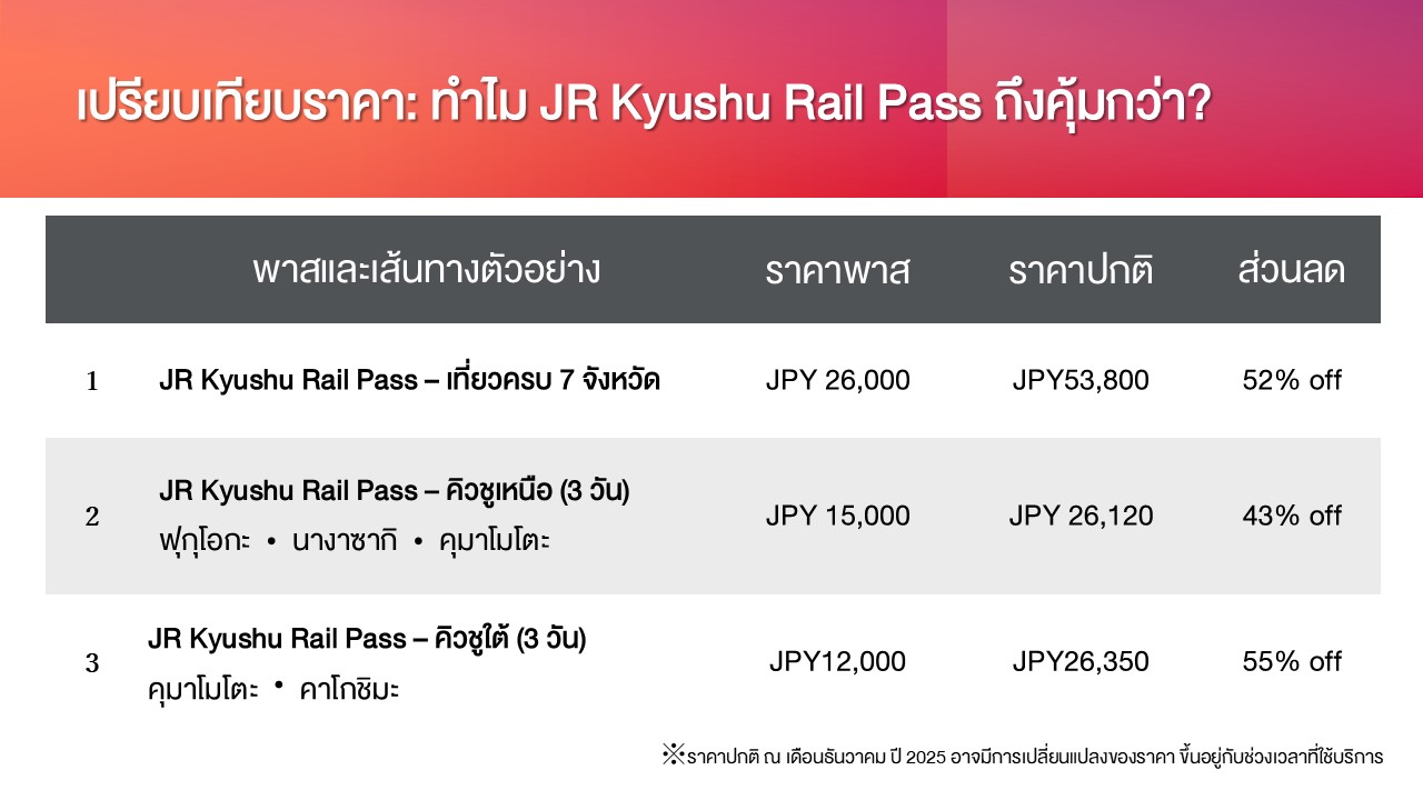 จากตารางจะเห็นได้ชัดว่า การใช้ JR Kyushu Rail Pass ช่วยลดค่าเดินทางได้อย่างมาก โดยเฉพาะผู้ที่ต้องเดินทางหลายเมืองภายในระยะเวลาสั้น ๆ