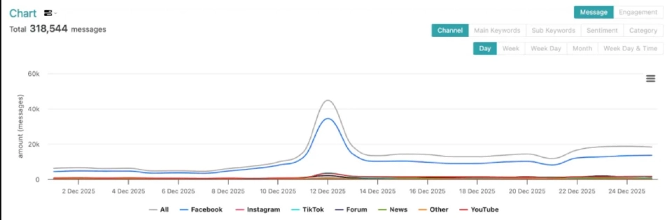 บริษัท ไวซ์ไซท์ (ประเทศไทย) ได้ทำการเก็บข้อมูลที่เกี่ยวข้องตั้งแต่วันที่ 1-25 ธันวาคม 2568 ผ่านเครื่องมือ Zocial Eye ปรากฏว่ามีการพูดถึงบนโซเชียลมีเดียสูงถึง 46,821,649 เอนเกจเมนต์ จาก 318,544 ข้อความ