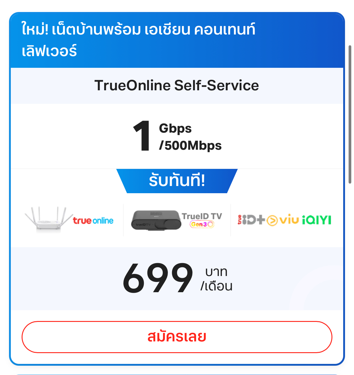 เห็นโปรปัจจุบันถูกมาก ถูกกว่าลูกค้าเก่าเยอะเลย ของเดิม 799 ได้ เน็ต 1G/200Mb + True Vision Enjoy + ซิม(ไม่ได้ใช้) โปรลูกค้าใหม่ 599 ได้ เน็ต 500Mb/500Mb + Tr